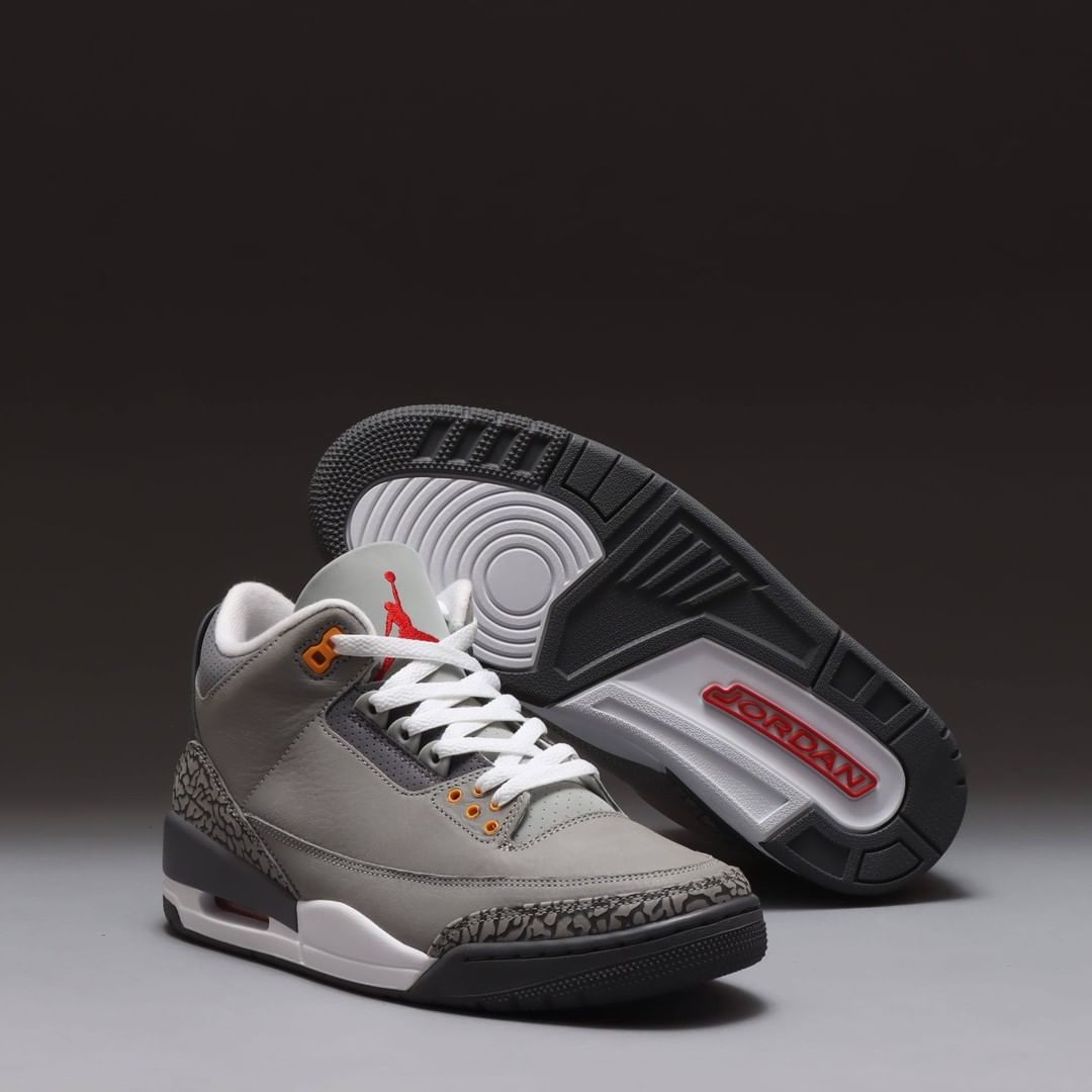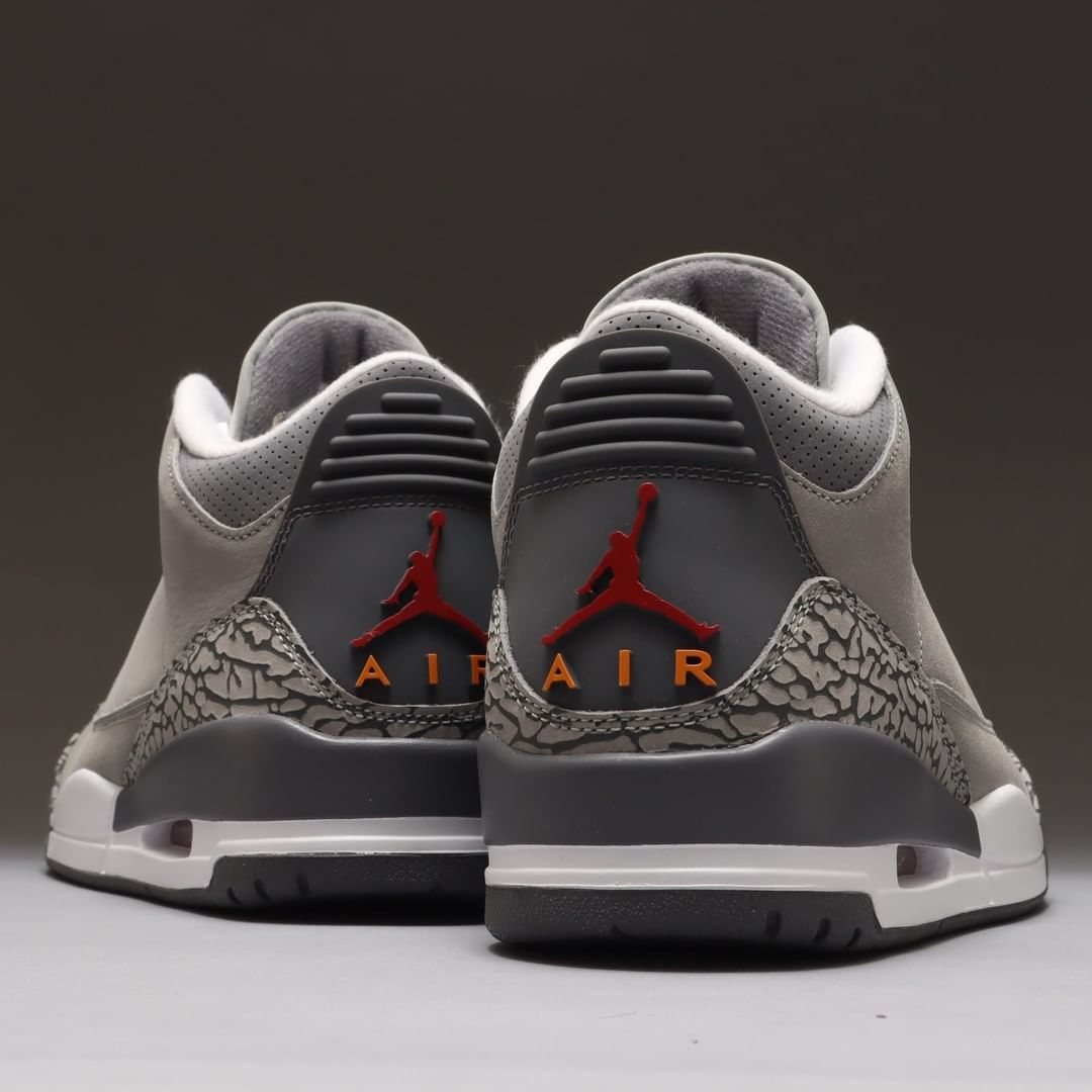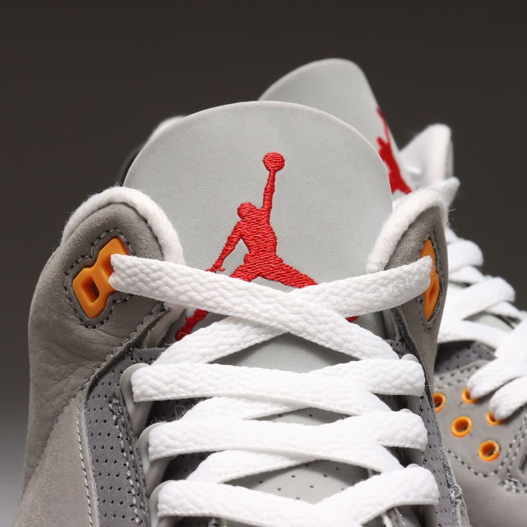 Air Jordan 3 “Cool Grey” 保留了三代鞋型最为经典的爆裂纹装饰,灰色的皮革鞋身搭配灰色的鞋舌,衬托了红色 Jumpman Logo 和亮色孔眼。