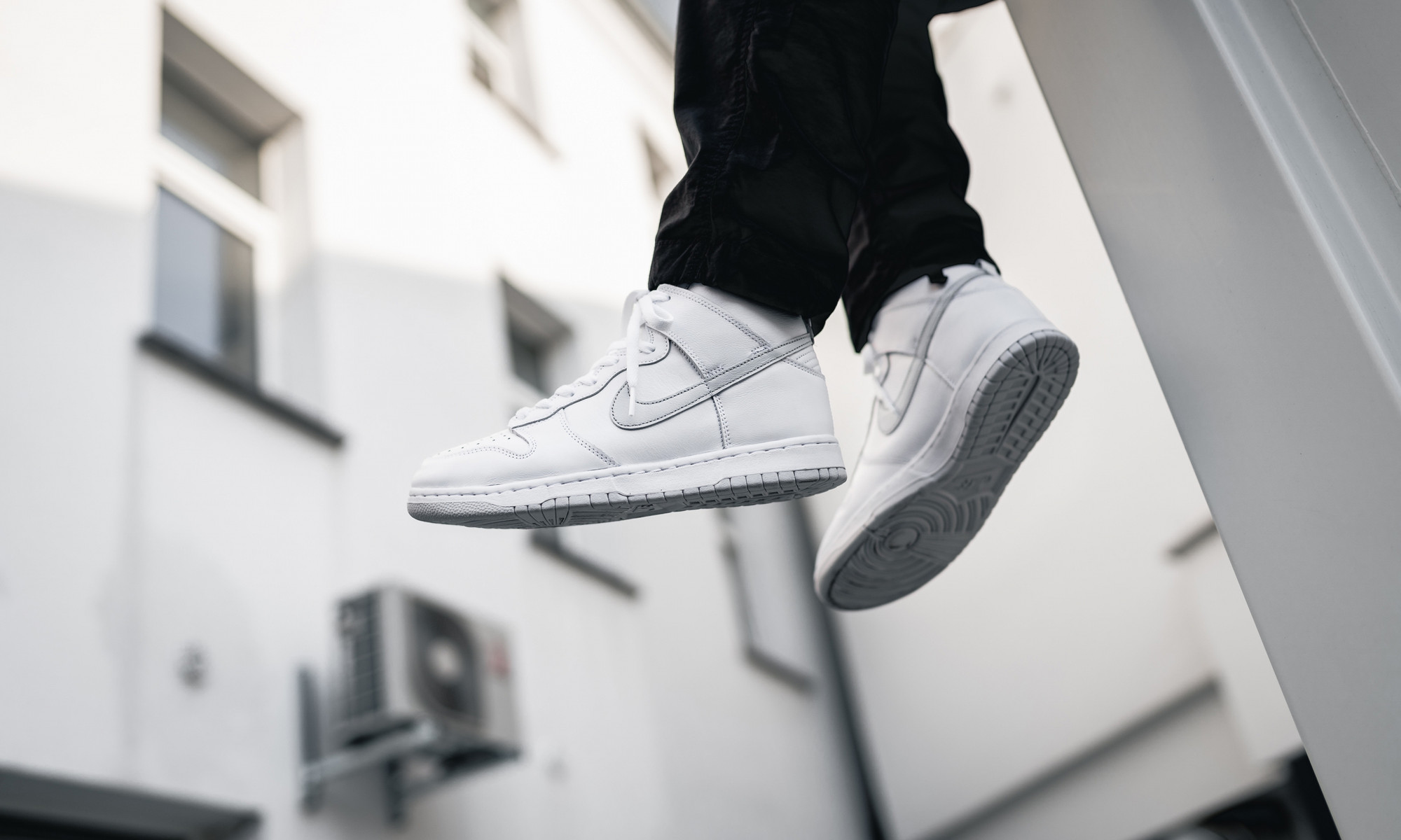 这双 Dunk High 不论是配色还是外形都和白灰 Air Jordan 1 几乎一模一样,白色鞋面加入银灰色 Swoosh,整体视觉感受极其简约。