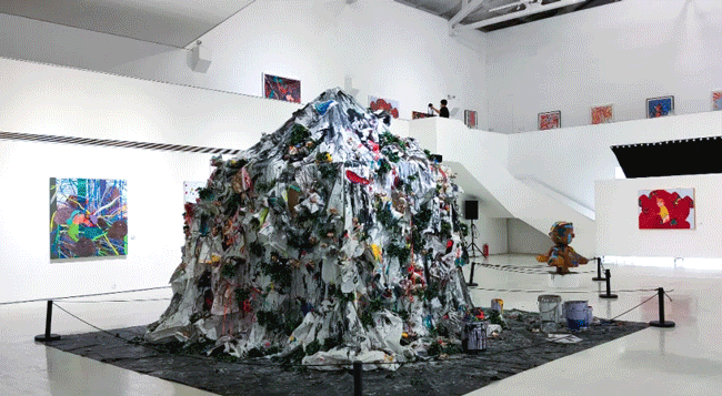 更夸张的是,去年夏天在北京 798 悦美术馆,他们将目前最火的 50 双球鞋,通过做旧、涂鸦等手法 “残忍” 拆解,打造了一个环保艺术装置《Straggle Rubbish》。