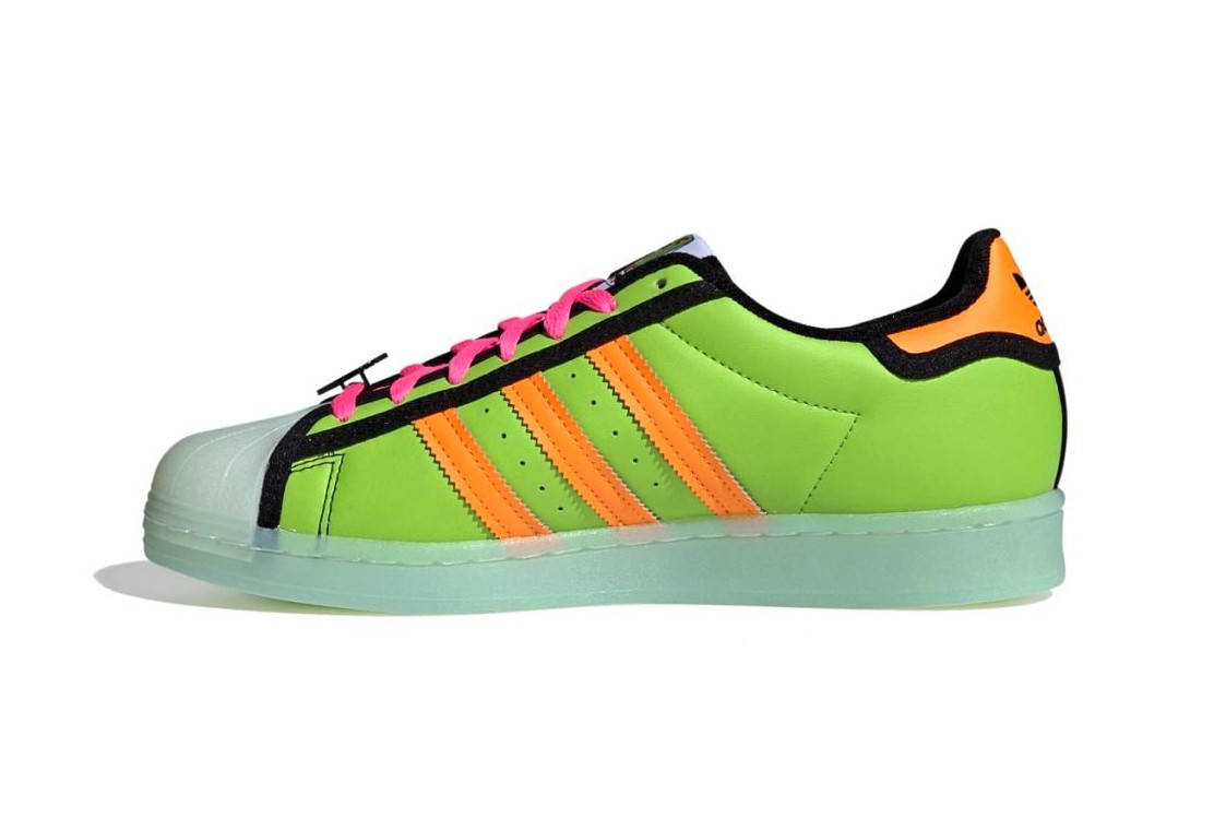 鞋头及中底采用淡绿色水晶材质打造,在 Superstar 系列中属于很罕见的设计,带来十分清爽的感觉。