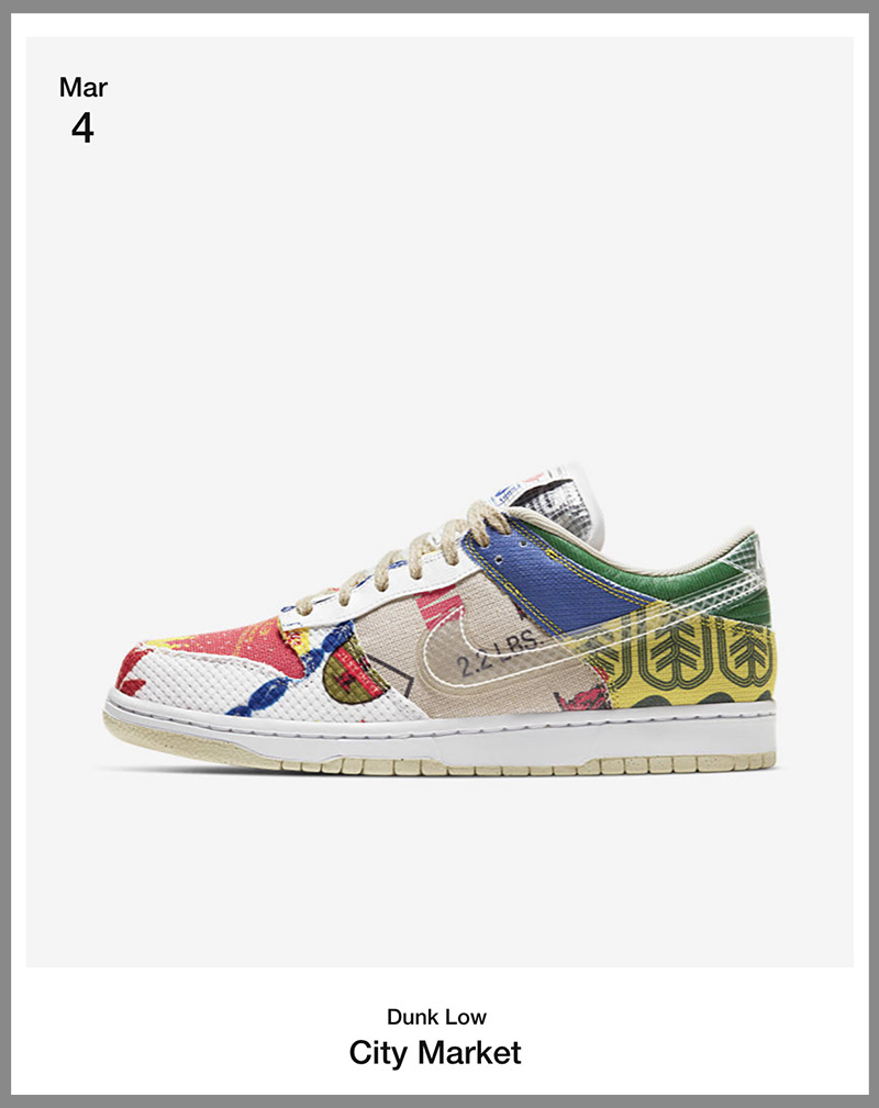 目前,这款酷炫又好玩的 Nike Dunk Low “City Market” 已在美区 SNKRS 上架预告,确定将在 3 月 4 日正式发售,定价 $110 美元。