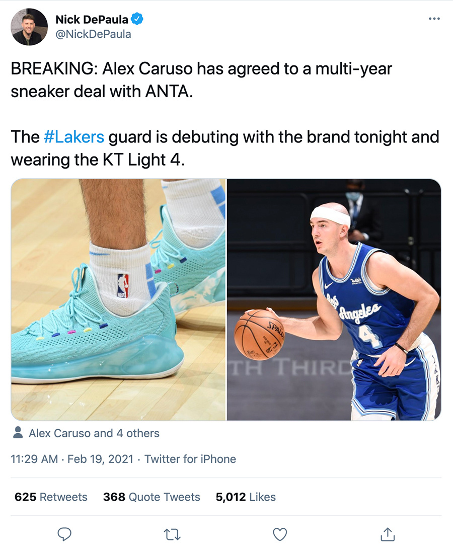 随后 ESPN 记者 Nick DePaula 称卡鲁索已经与安踏达成一份多年的球鞋合同,正式成为安踏篮球大家庭的一员。