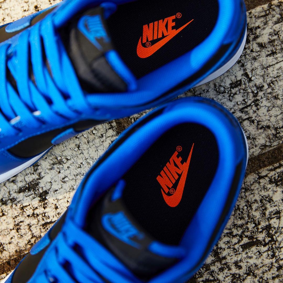 另一双 Dunk Low 则采用经典的黑蓝装扮,搭配白色中底以及蓝色外底,营造干练的复古气质。