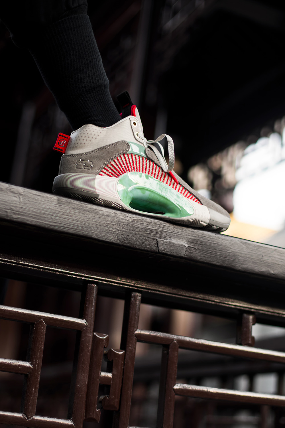 左脚后跟保留了 06 版死亡之吻的 CLOT 专属 Logo,而右脚后跟则改为代表上海的 “申” 字图案,同样推出了一个被称为 "天书" 特殊鞋盒。