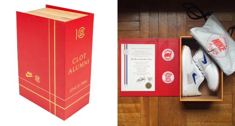 为了庆祝 CLOT 与 Nike 合作 10 周年纪念,以 Lunar Force 1 为蓝本,推出类似 “毕业生” 灵感的纪念联名 CLOT x Nike Lunar Force 1 “Alumni”。