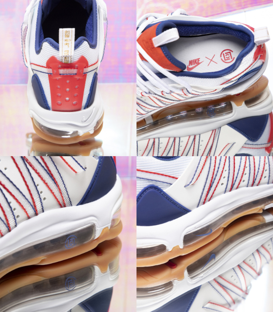 蓝红两色鸳鸯 Swoosh 搭配后跟刺绣 CLOT 10 周年专属 Logo。