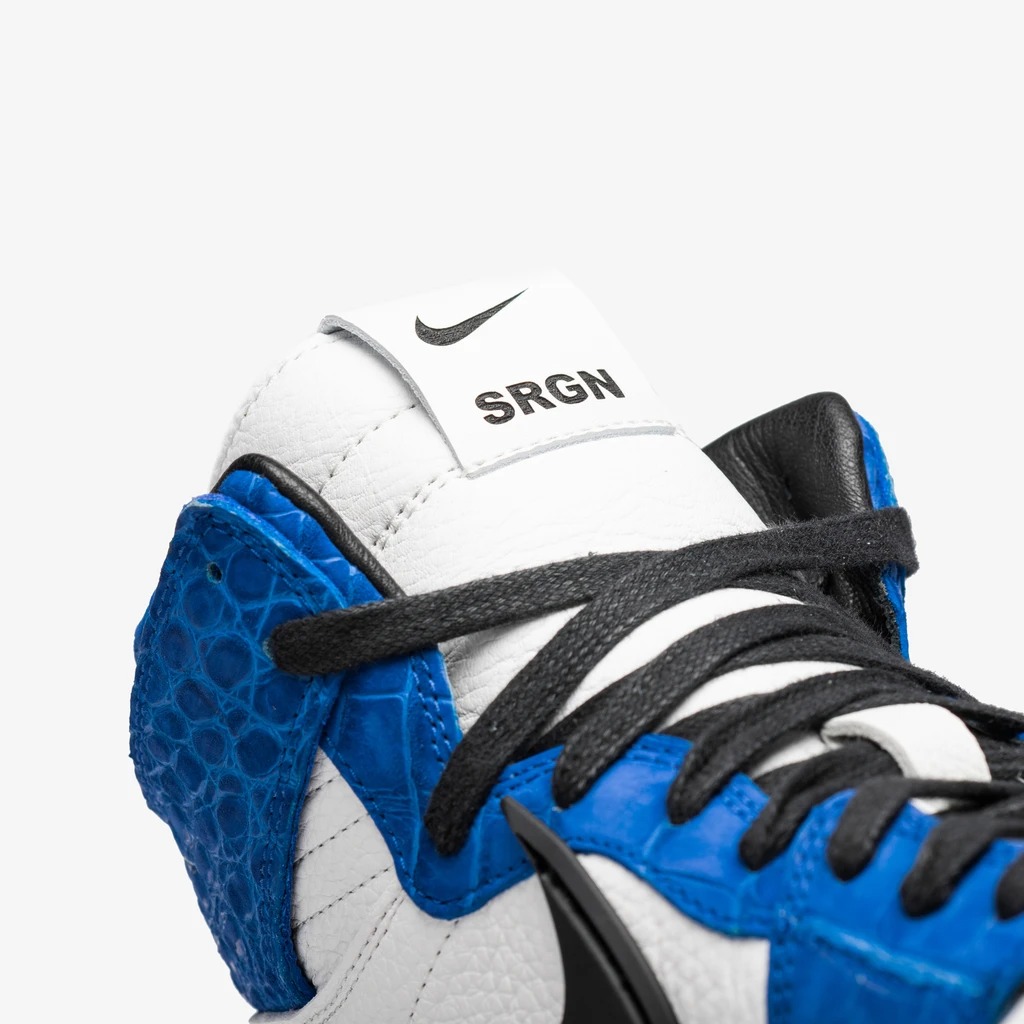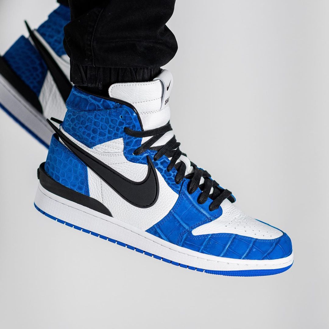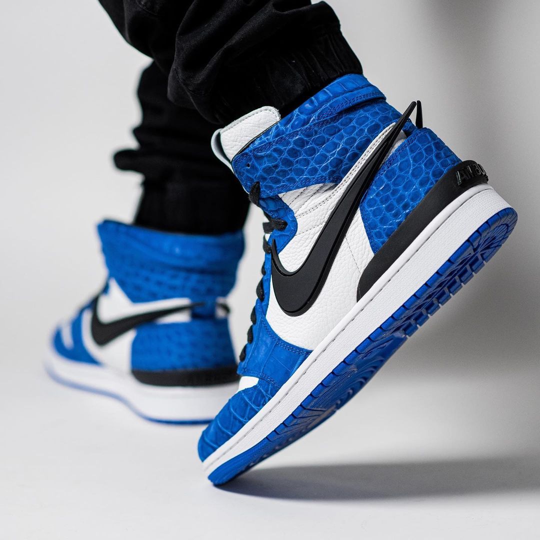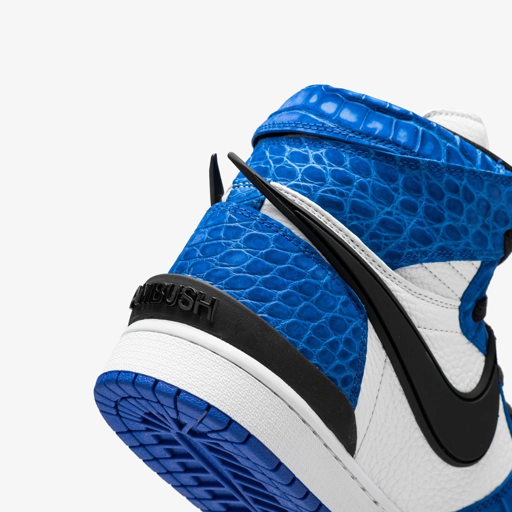 这种定制都是先把官方的真鞋进行拆解,保留了 AMBUSH x Nike Dunk Hi 的标志性细节(超大 Swoosh 及后跟黑色 TPU 装饰等),只在鞋面上大作文章。