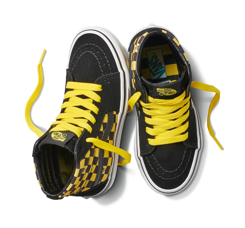 第四双当属 Sk8-Hi 鞋款,将威利的宿敌奥德洛附着其上,在鞋腰处搭配黑黄棋盘格图案。
