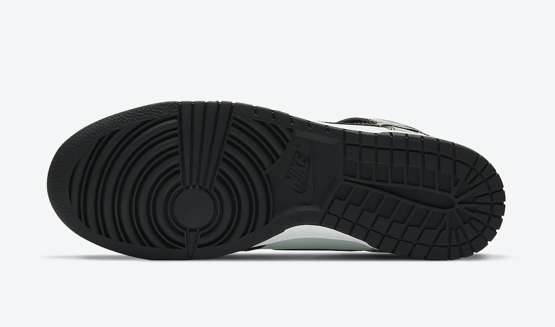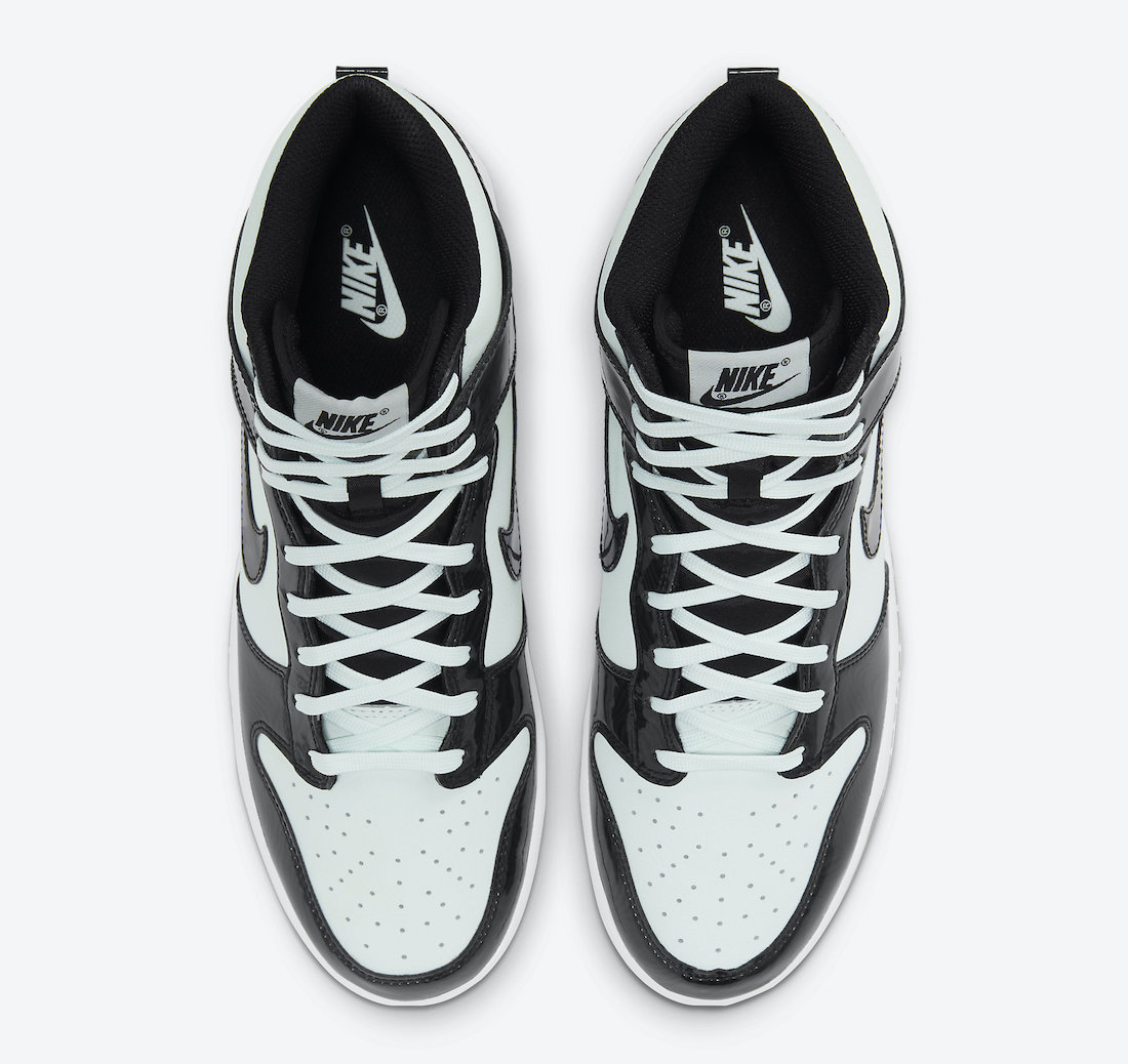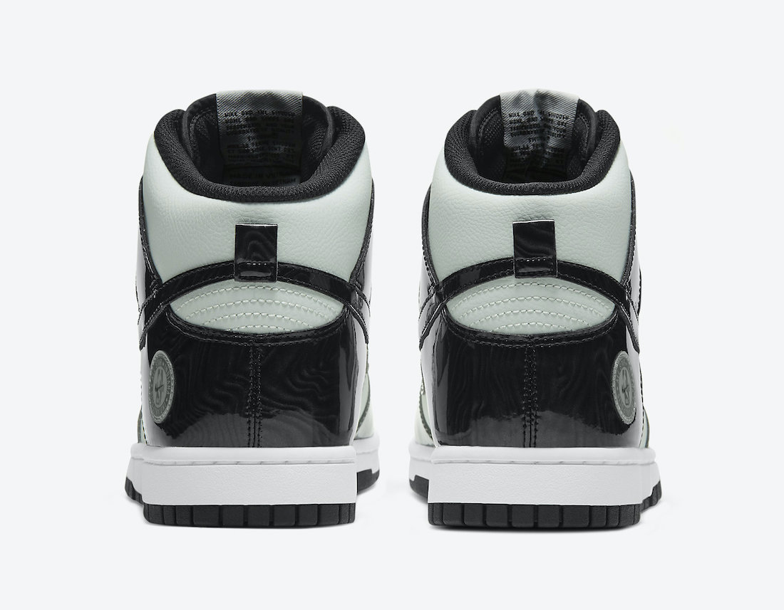 全明星 Dunk High 同样以黑色和薄荷绿为主色调,视觉上比全明星喷要更加清新醒目,整体风格与「钻石」Dunk 有着较大的相似度。