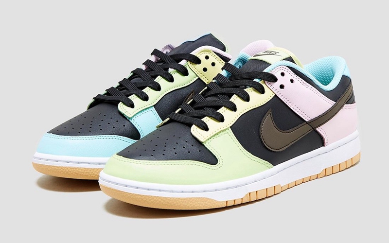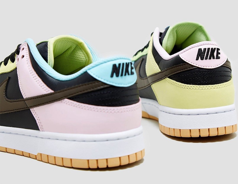 第一双以黑色为主调,以不对对称撞色鸳鸯拼接示人,蓝黄绿粉多种马卡龙色块拼接在一起,侧身处点缀棕色 Swoosh Logo,不仅活力十足且相当吸睛。