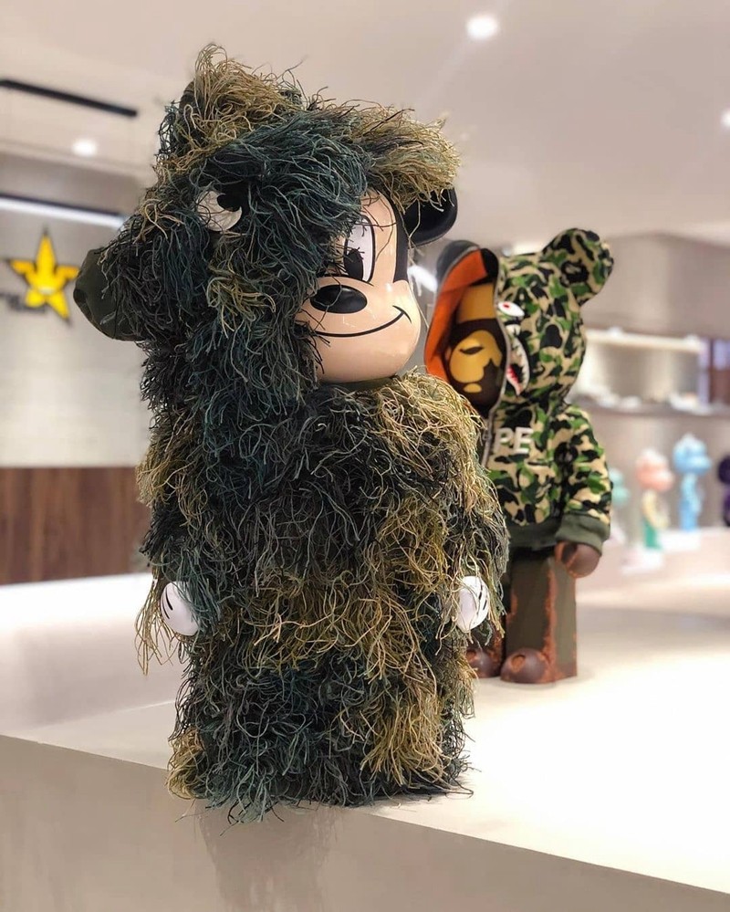 而在 2018 年 READYMADE 便携手 Disney,以 Mickey Mouse 样貌的 BE@RBRICK 作基底,并再铺上 READYMADE 式的迷彩吉利服 Ghillie Suit 建构,目前 1000% 的市价已经达到了 ¥70000 左右。