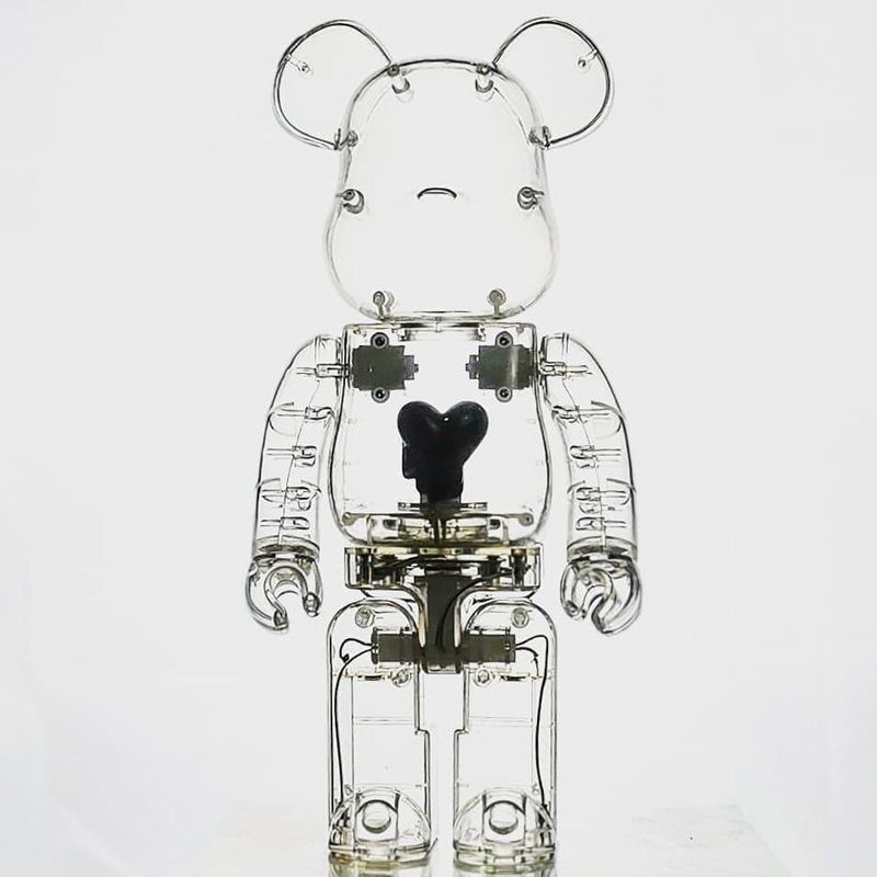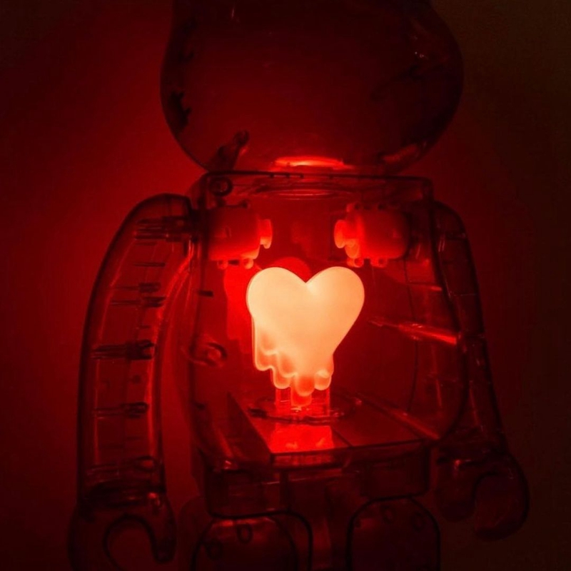 整体透明的 BE@RBRICK 造型与 “千秋款” 极为相似,正中央添加一颗黑色的融化爱心造型,视觉效果相当醒目,并且接电后可以作为台灯使用,由于是展会限定的缘故,目前 1000% 的市场价接近 ¥30000 元左右。