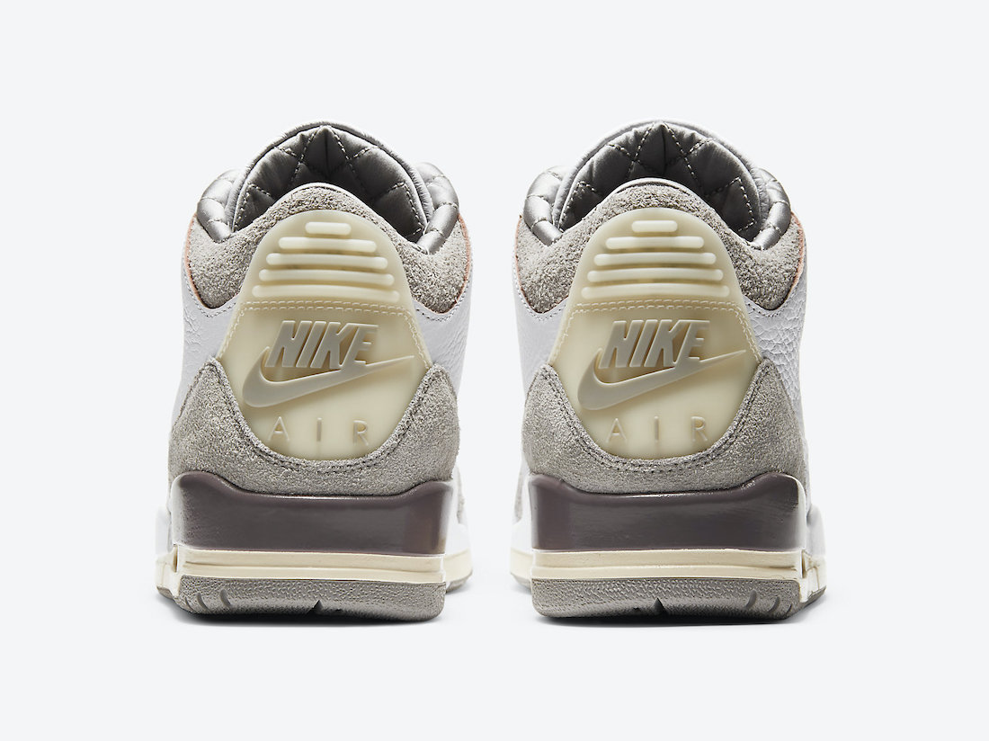 将鞋头、后跟的爆裂纹换成极具质感的灰色麂皮,带来不同于其他 Air Jordan 3 的独特气质。