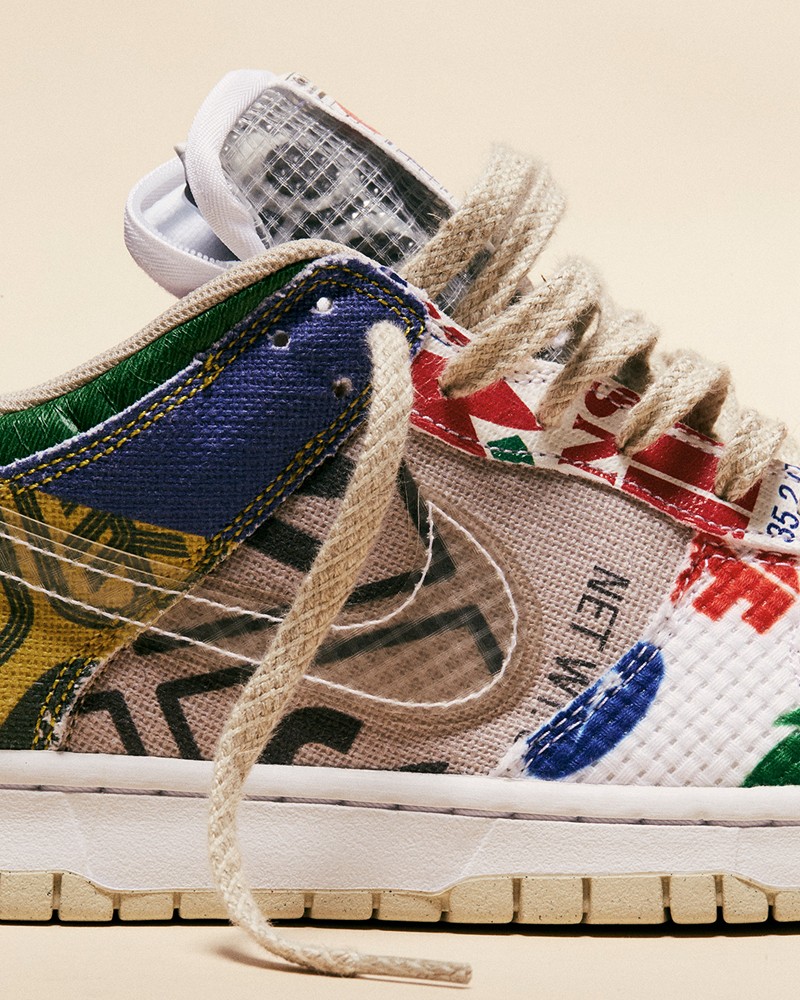 细看鞋身中还穿插有 Nike 及 Dunk 相关的图像文字,棉麻质感的鞋带,更有一种 TS x Dunk SB 联名的既视感,浑身都是戏。
