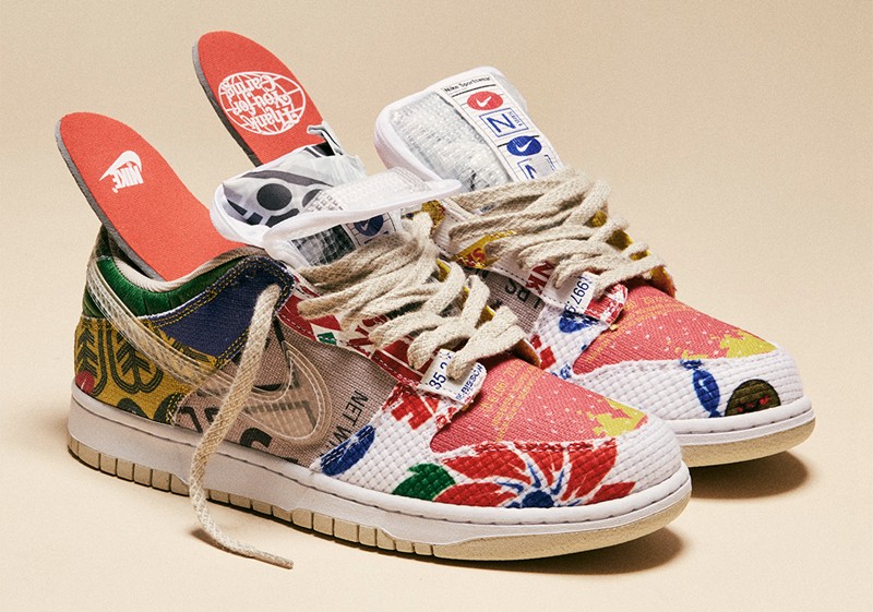 继年初爆竹 Dunk Low 展现出三层刮刮乐的疯狂创意后,近期一款 Dunk Low “City Market”则将不同材质的缝合拼接玩到了极致。