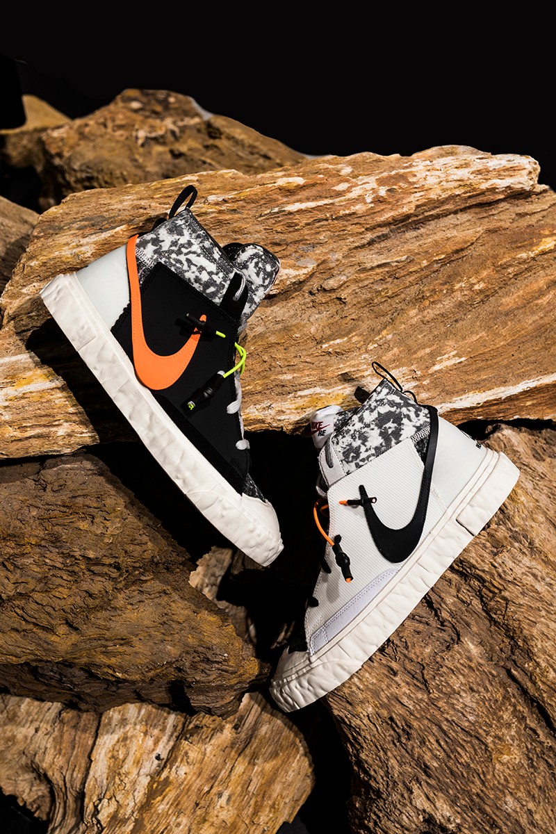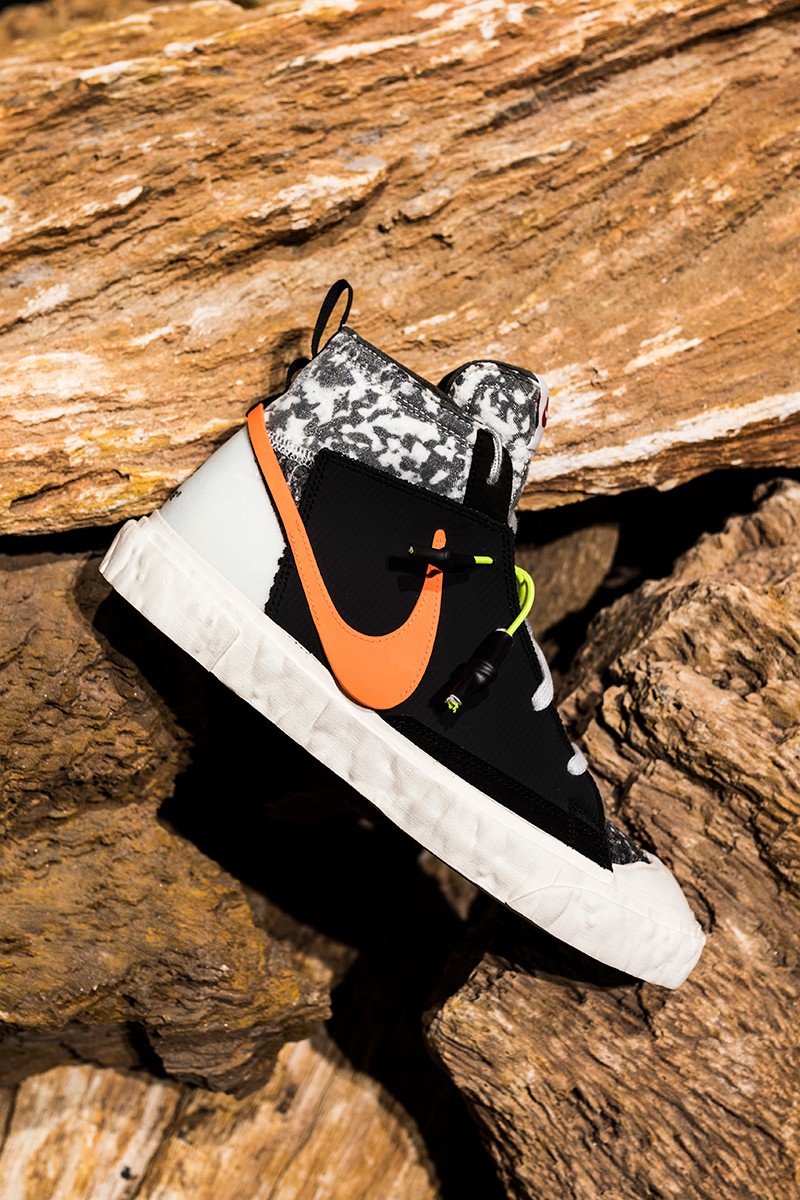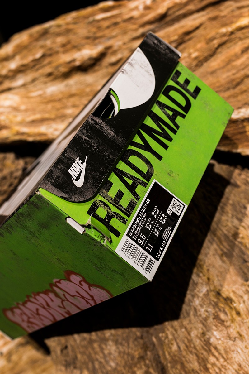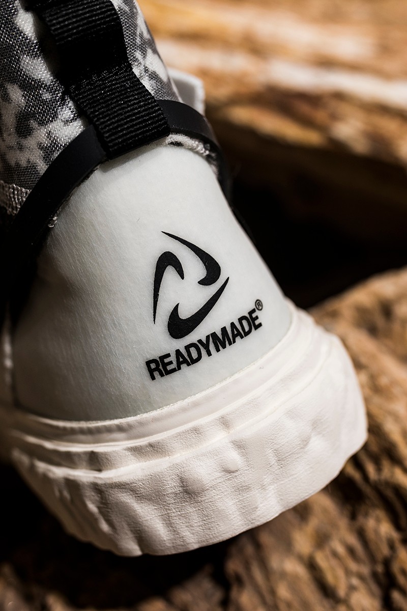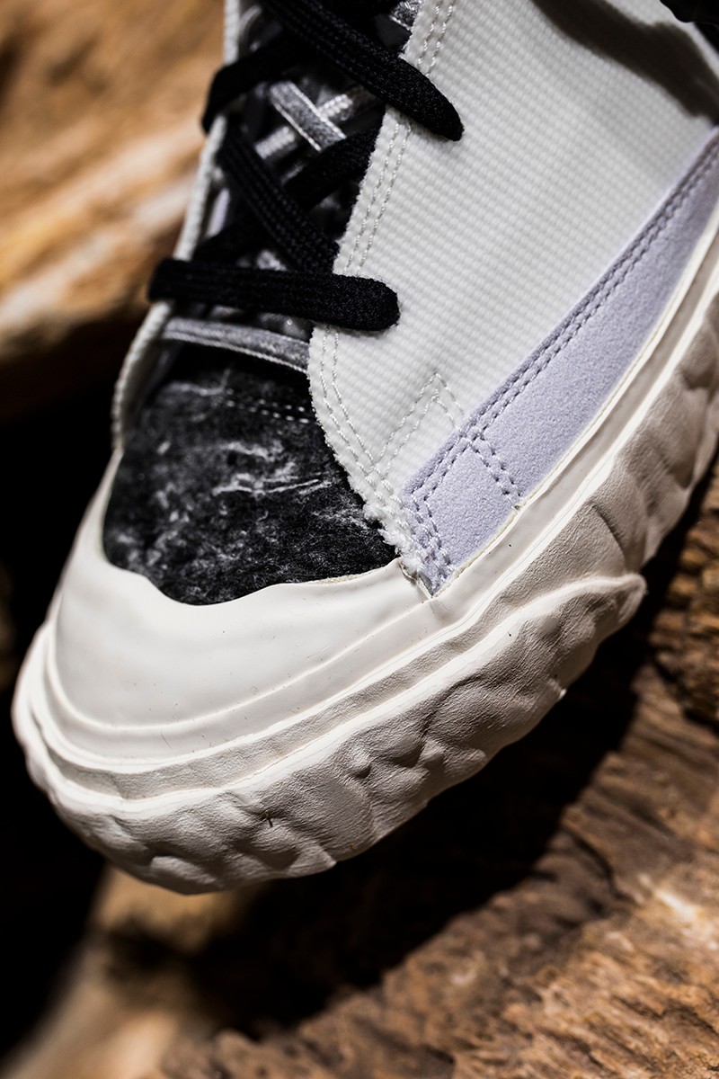 此次 READYMADE 与 Nike 以经典 Blazer Mid 作为设计蓝本,通过破坏、重构、拼接等 READYMADE 惯用的设计手法,实现了将 Blazer Mid 大刀阔斧的重做!