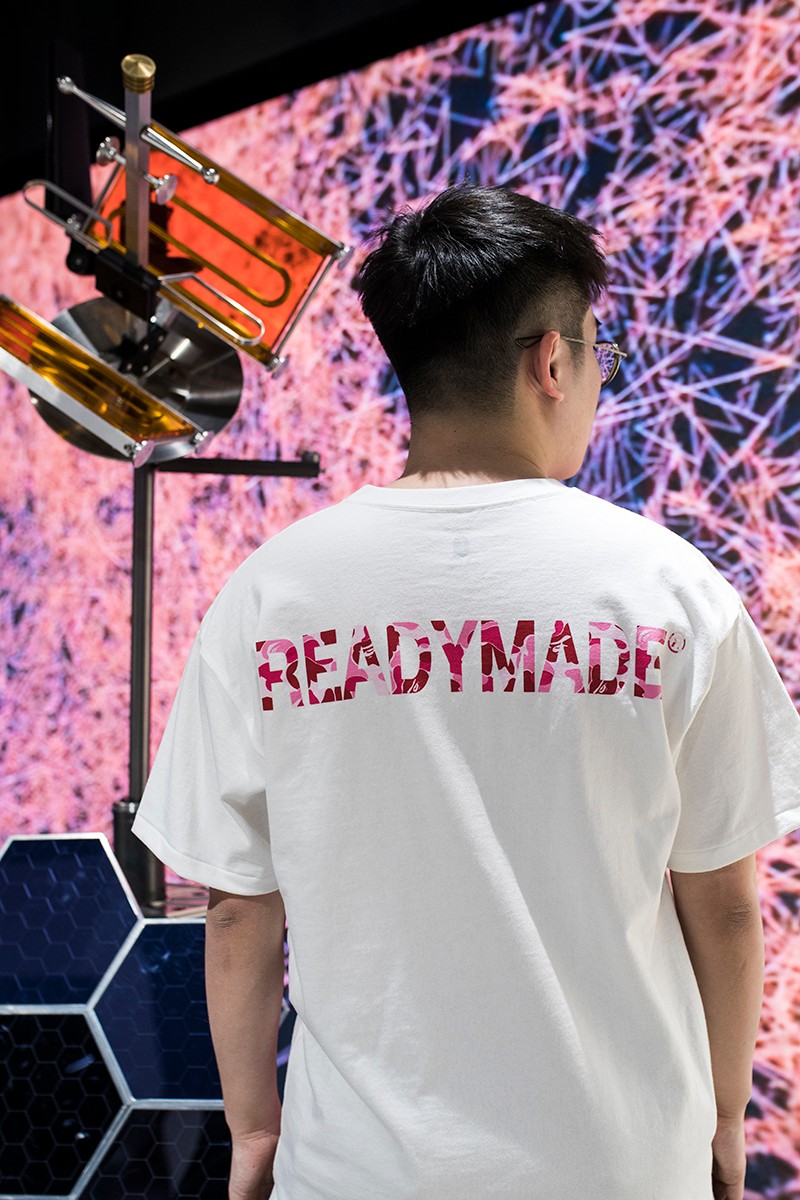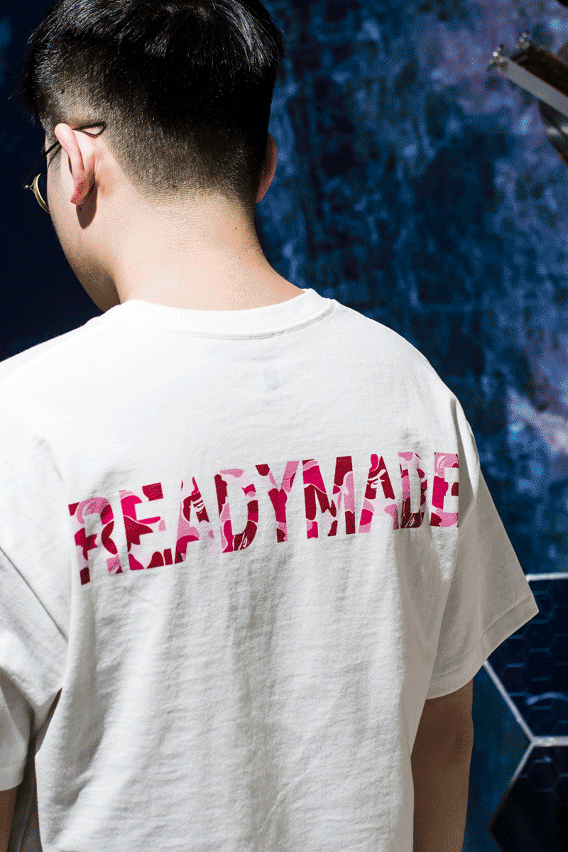 背后分别以蓝色、军绿色以及粉色 BAPE 迷彩图案填充 READYMADE 字样,在白色底色衬托下相当抢眼!