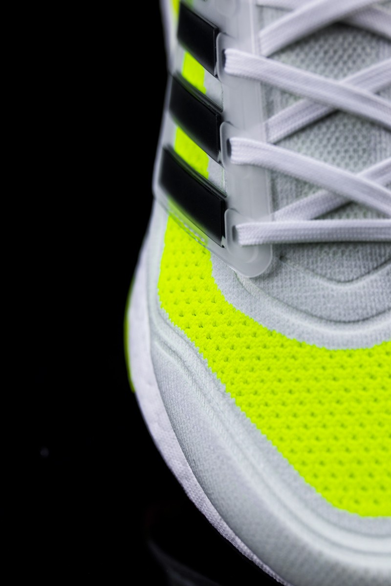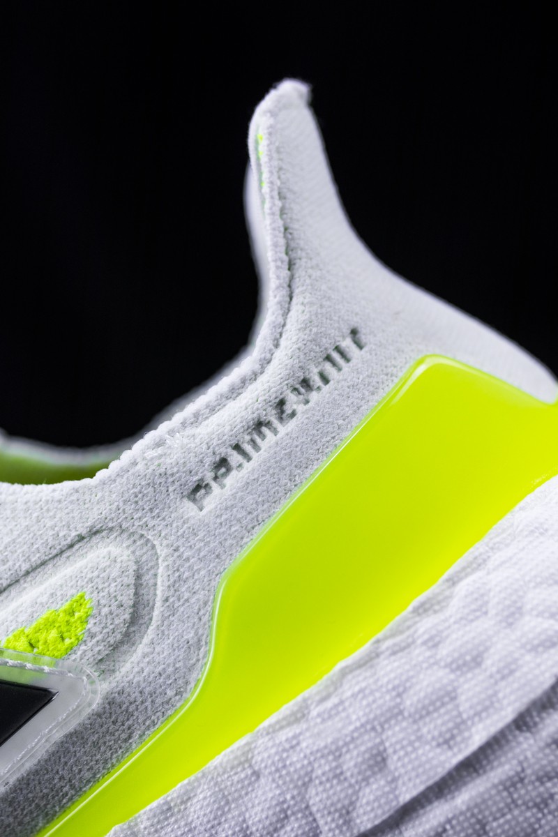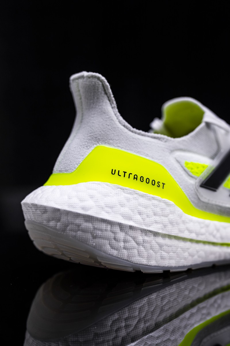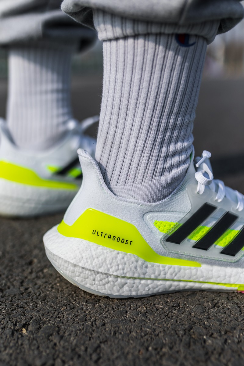 整双鞋以白色为主调,鞋面上点缀着亮眼的荧光绿色,再加上肉眼可见的超厚 Boost 中底,很难不让人眼前一亮。