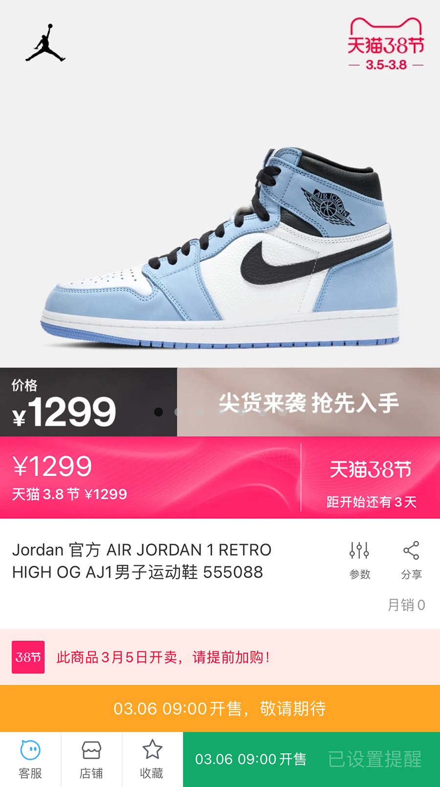 此外 Jordan 天猫旗舰店目前已经上架预告,确定将于 3 月 6 日上午 9 点正式发售,感兴趣的朋友可以点击下方淘口令提前关注。