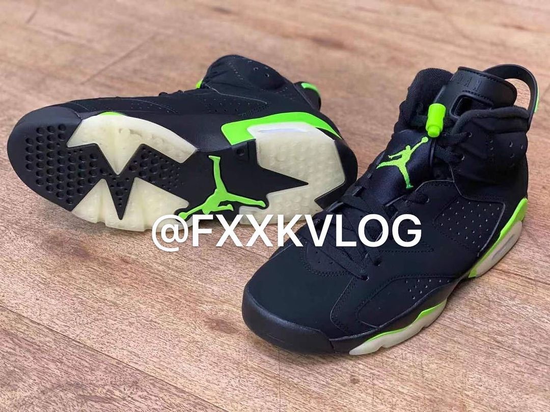 整双鞋在 Air Jordan 6 的基础上采用大面积黑色作为主调,鞋带扣、Jumpman Logo、后跟鞋提以及中底点缀荧光绿色。