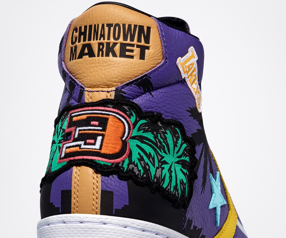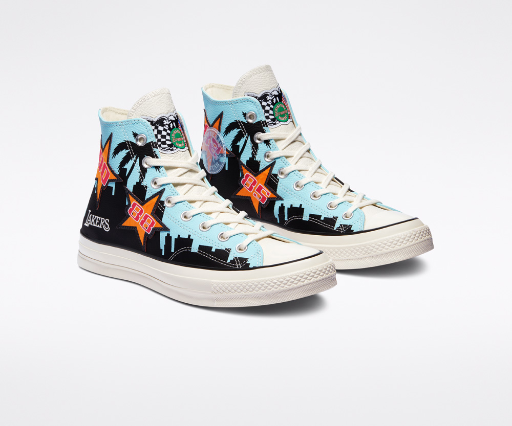 湖蓝色 Chuck 70 与紫色 Pro Leather 均呼应这件夹克的配色,同时还延续了洛杉矶天际线剪影及印花元素。