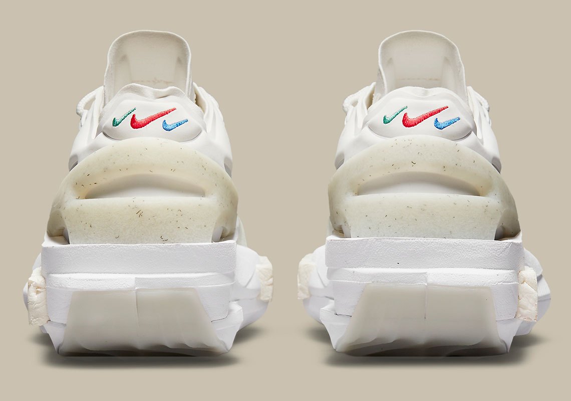 新款 Nike Fontanka Edge 后跟部分绣有绿,红,蓝三种颜色的小号 Nike Swoosh,细节十分精致。