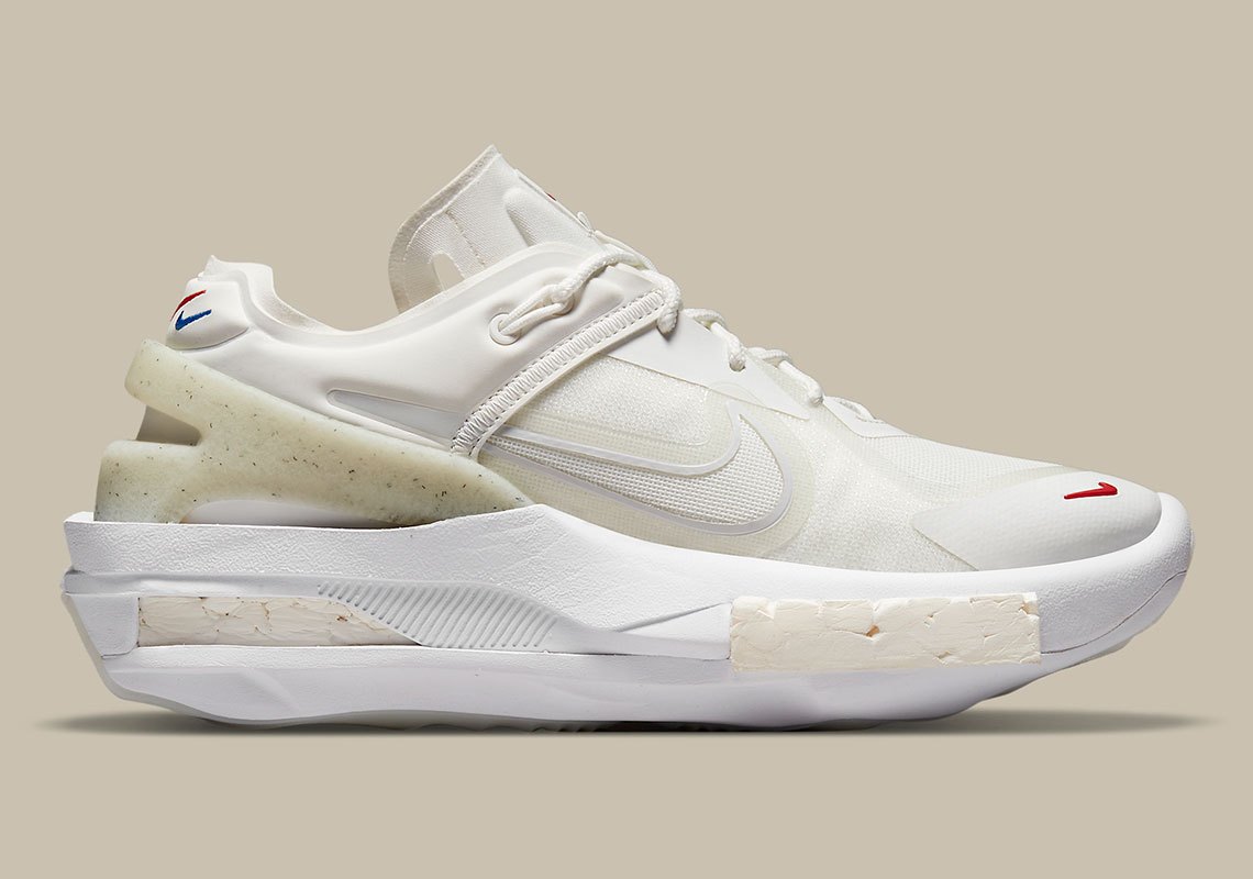 新款 Nike Fontanka Edge 鞋面为白色透气织物,并以红色 Nike Swoosh 作点缀。