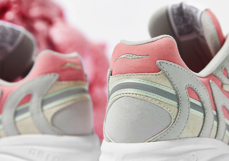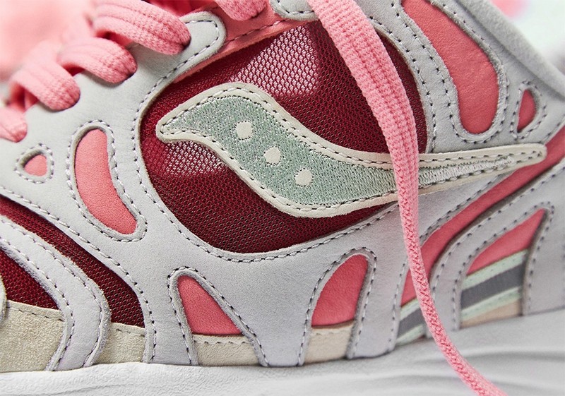 整双鞋以 Saucony Azura 2000 为蓝本,通体灰粉双色的鞋身,十分切合本次的联名主题 —— 大脑。