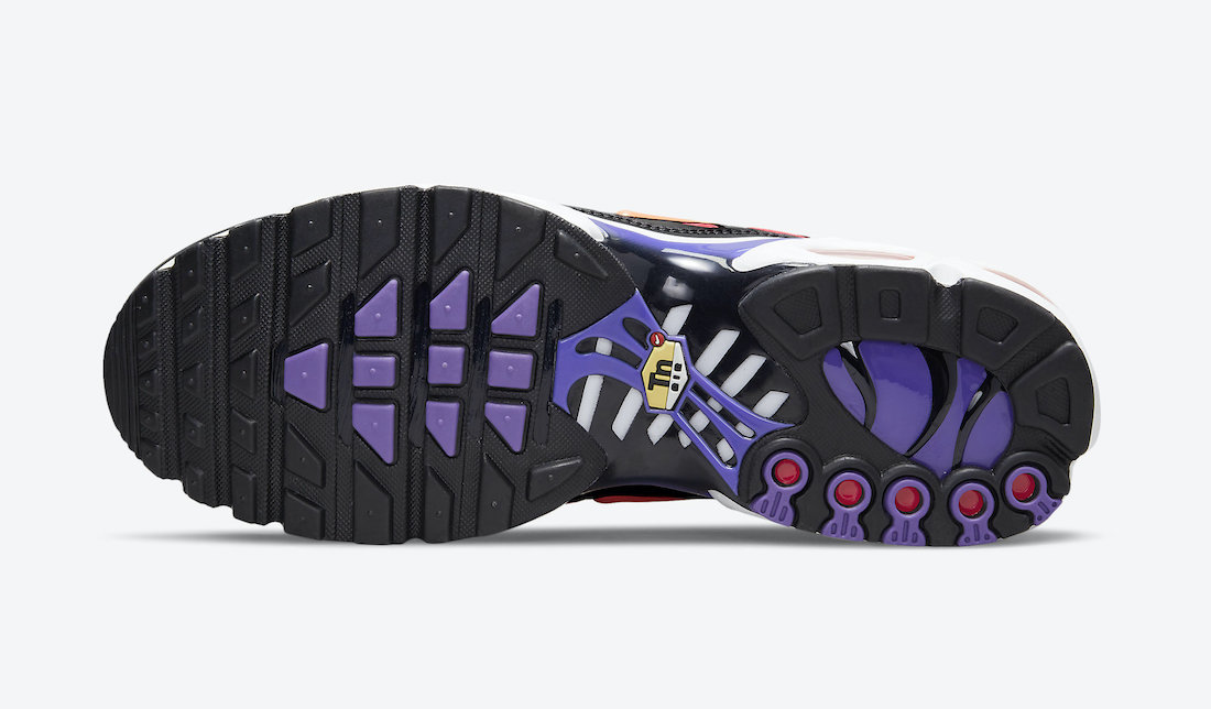 中底采用白色装扮,前后掌衔接出搭载紫色 TPU,同时外露的 Air Max 气垫搭配上橙色、红色,呼应鞋面配色设计。