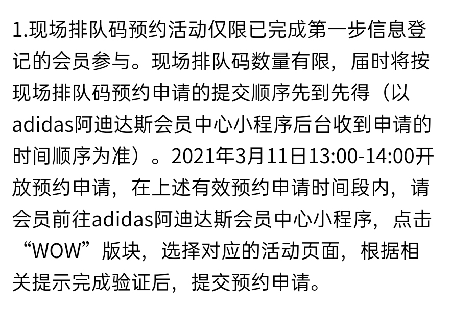 「adidas会员」小程序登记在今天 12 点结束,13 点即将开启排队码预约。