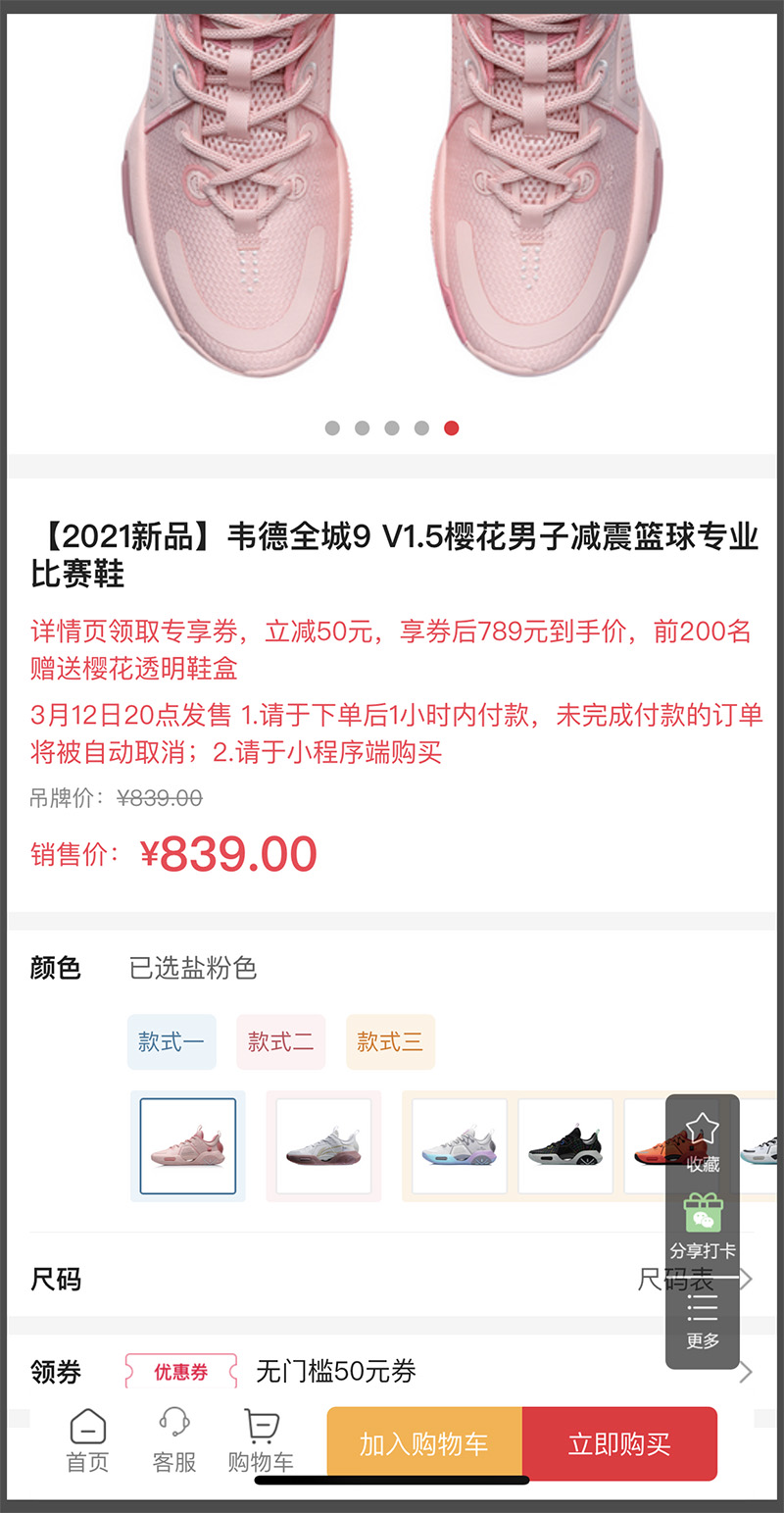 目前官方小程序已上架,前 200 名还会额外赠送专属樱花透明鞋盒,且目前还有 50 元优惠券可领,最终到手价只要 ¥789 RMB。