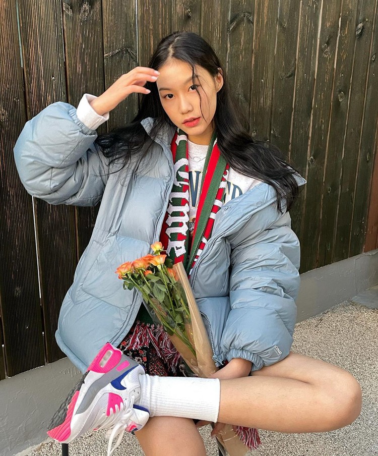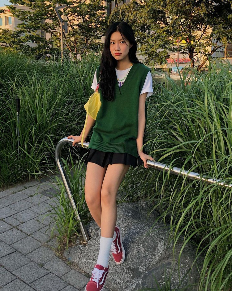 时不时地上脚几双 Converse、Nike,展现出不一样的甜美气息。