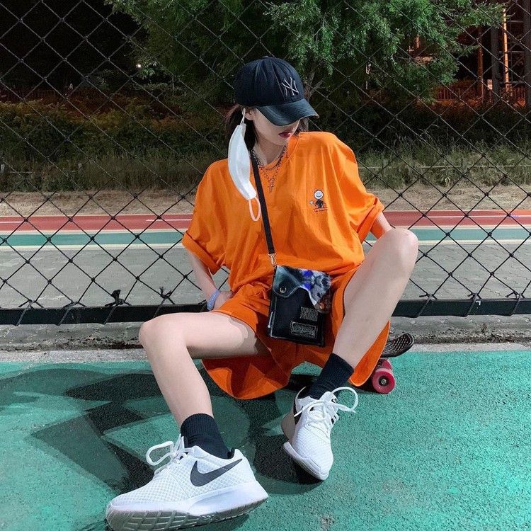 一身 Oversize 橙色套装加脚踩 Nike 跑鞋,活力满满。