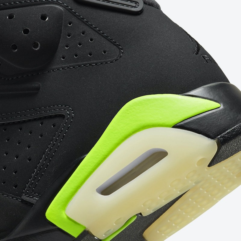 鞋身以大面积黑色为主,鞋带扣、Jumpman Logo、后跟鞋提以及中底同时点缀荧光绿色,在黑色的衬托下,相比「俄勒冈」PE 还是有一定色差。