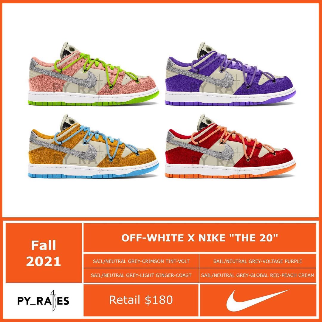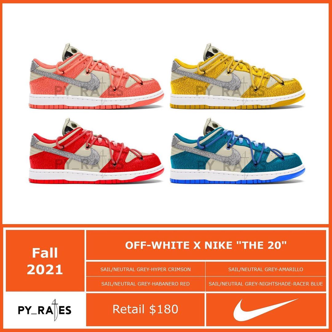 目前消息称,全新 OFF-WHITE x Nike Dunk Low “THE 20” 预计将于 2021 年秋季正式发售,每双鞋的发售价格为 $180 美元。