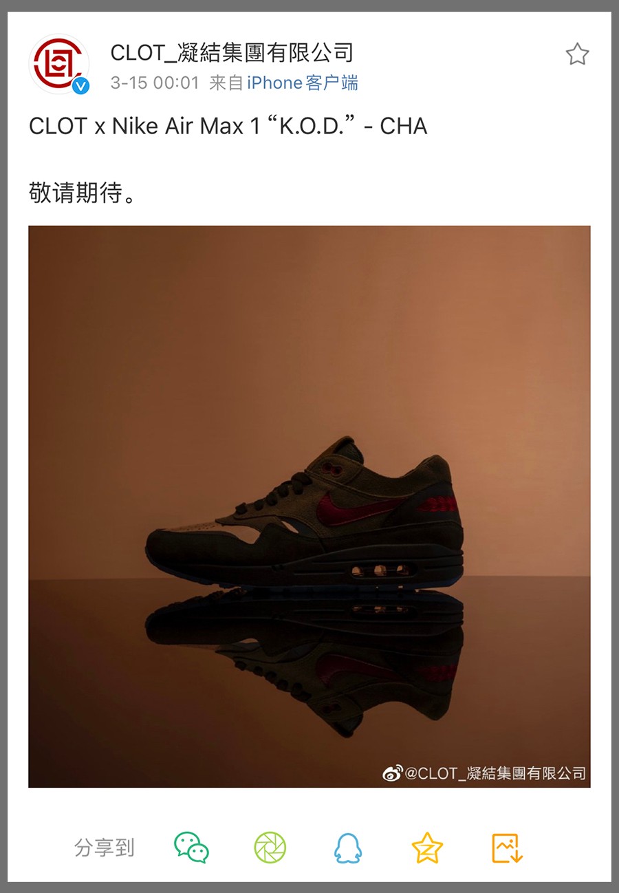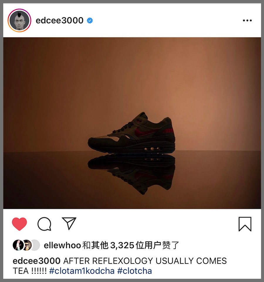 果然,冠希哥刚刚在个人社交账号上,亲自曝光今年第二款「死亡之吻」CLOT x Air Max 1,并表示「通常做完足疗,得来杯茶」。