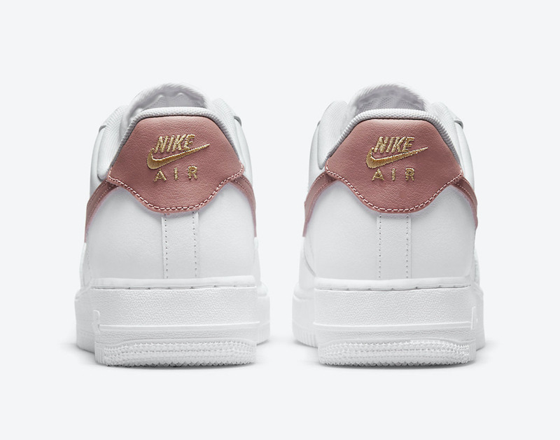 以经典纯白配色为基础,Swoosh 使用锈蚀粉色呈现,并以金色车线缝合。