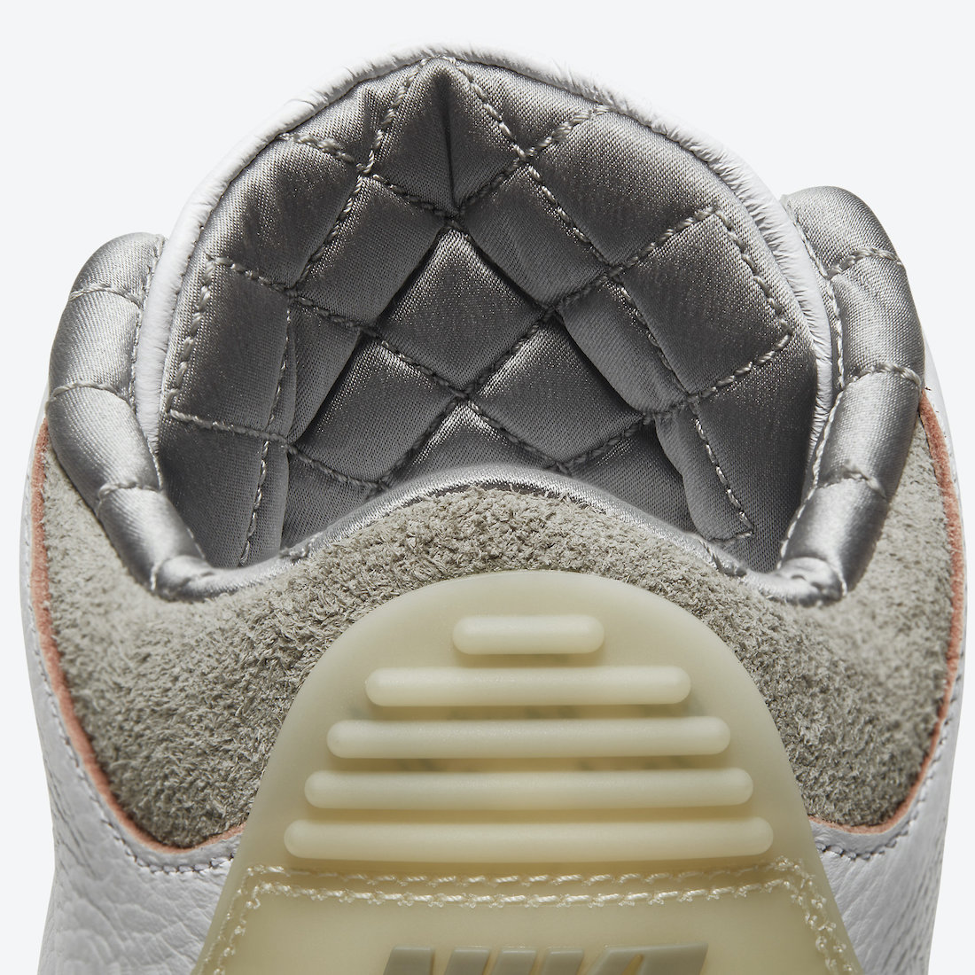 将鞋头、后跟的爆裂纹换成极具质感的灰色麂皮,带来不同于其他 Air Jordan 3 的独特气质。