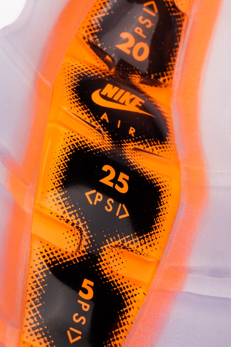 透过高规格淡蓝色水晶外底,还可看见内里的巨大 Nike Logo 以及 AIR 字样。