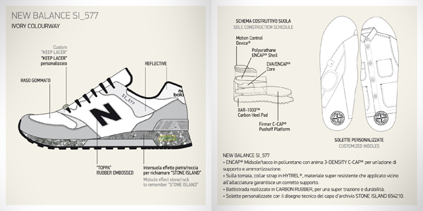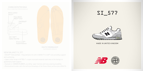 双方曾于 2013 年,打造过一组 New Balance 577 套装,鞋舌、鞋带扣及鞋垫都注入 Stone Island 设计元素点缀。