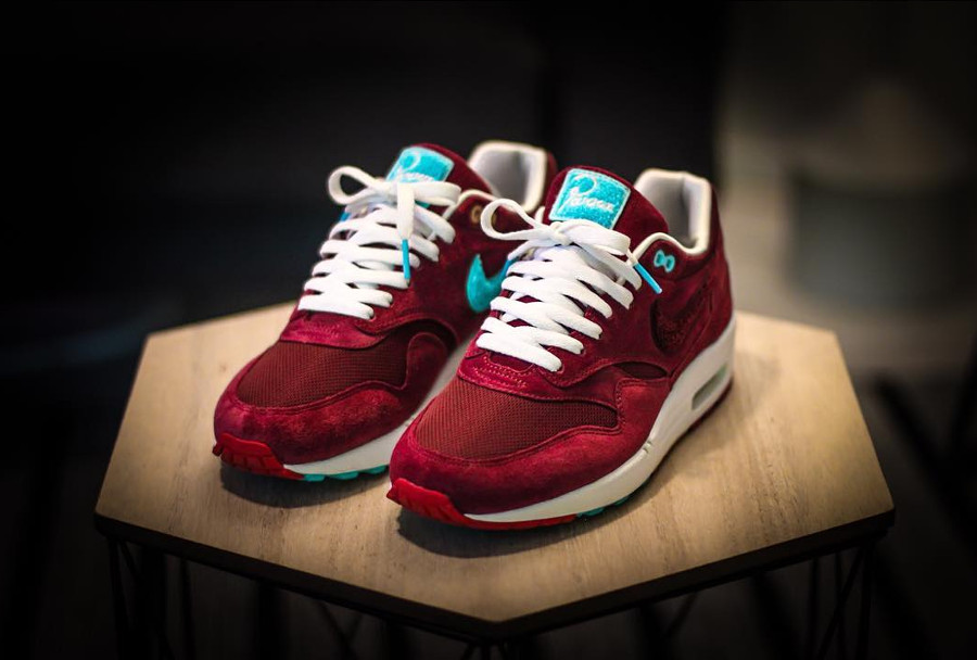 而上面提到的 Parra x Patta x Air Max 1 "Cherrywood",整体鞋身以 Patta 标志性的酒红为主调,细节则注入 Parra 最爱的粉末蓝色点缀。