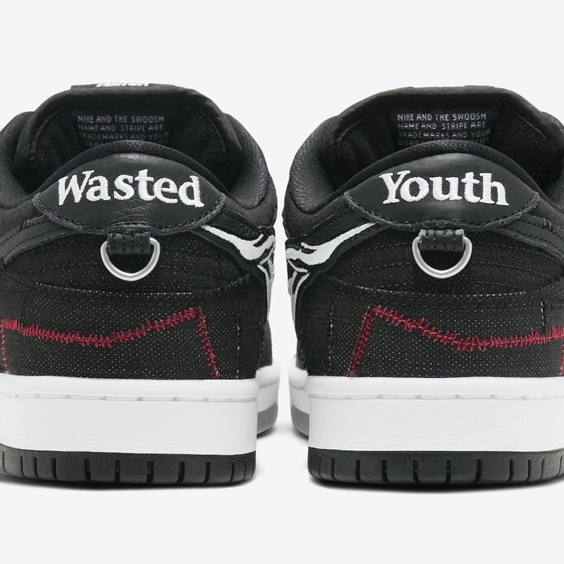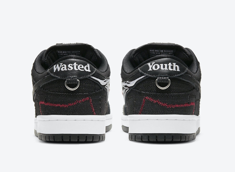 后跟部分带有金属提环,同时将传统的 Nike 字样替换为 “Wasted” 和 “Youth” 的白色刺绣。