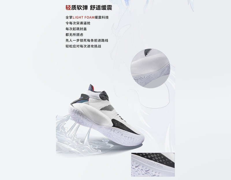 中底使用全掌 LIGHT FOAM 缓震科技,在保证轻质化的同时,为运动员提供十分软弹舒适的脚感。