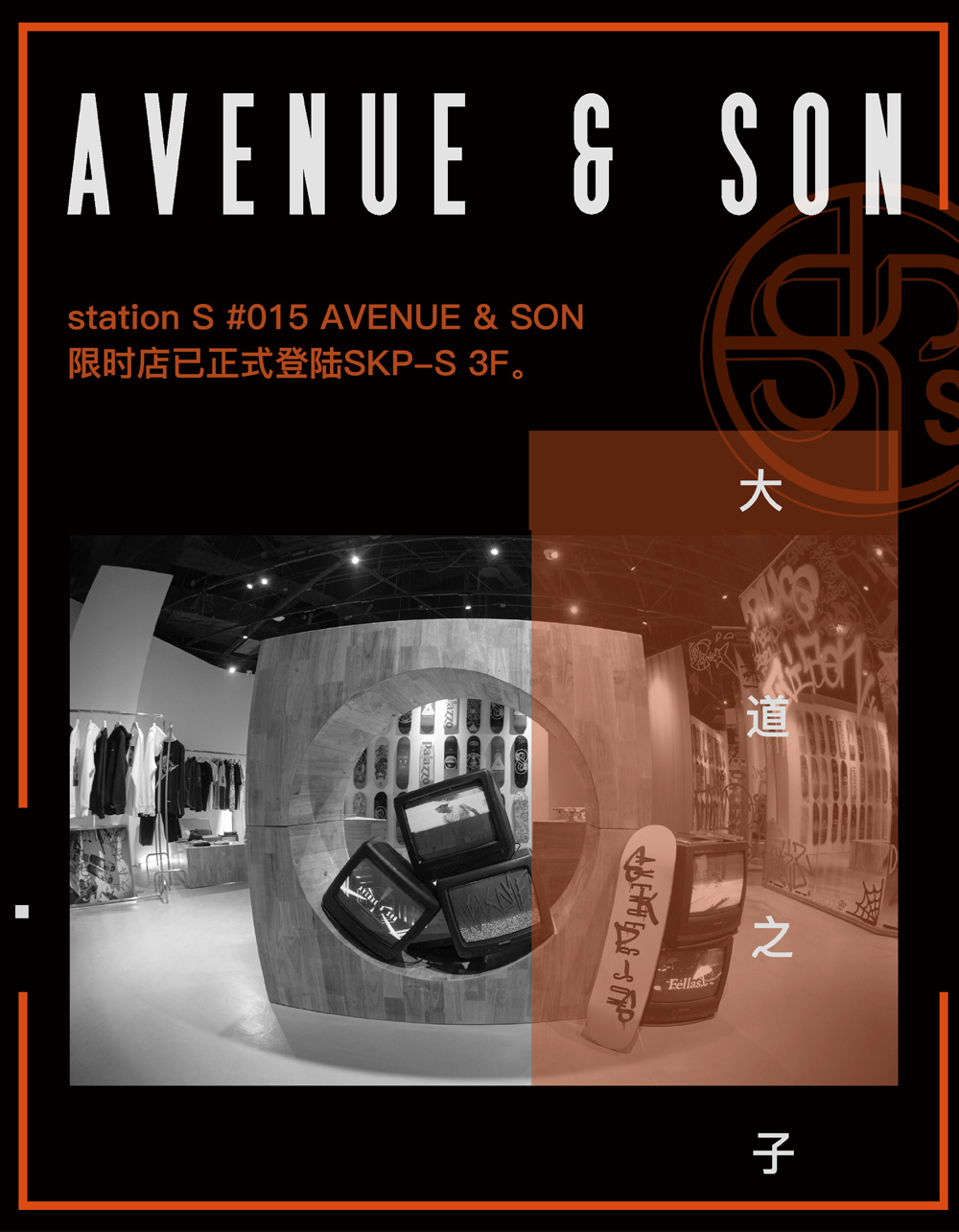 近期北京 SKP-S station S #015 AVENUE & SON 限时店开启,还将在明天举行滑板爱好者派对活动。