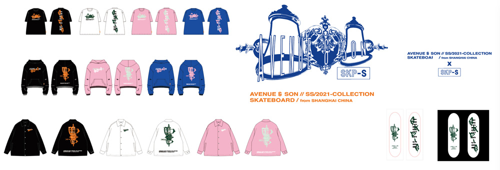 当天还有 SKP-S x AVENUE & SON 独家合作系列限定发售。包括联名滑板及 T 恤、帽衫、教练夹克。