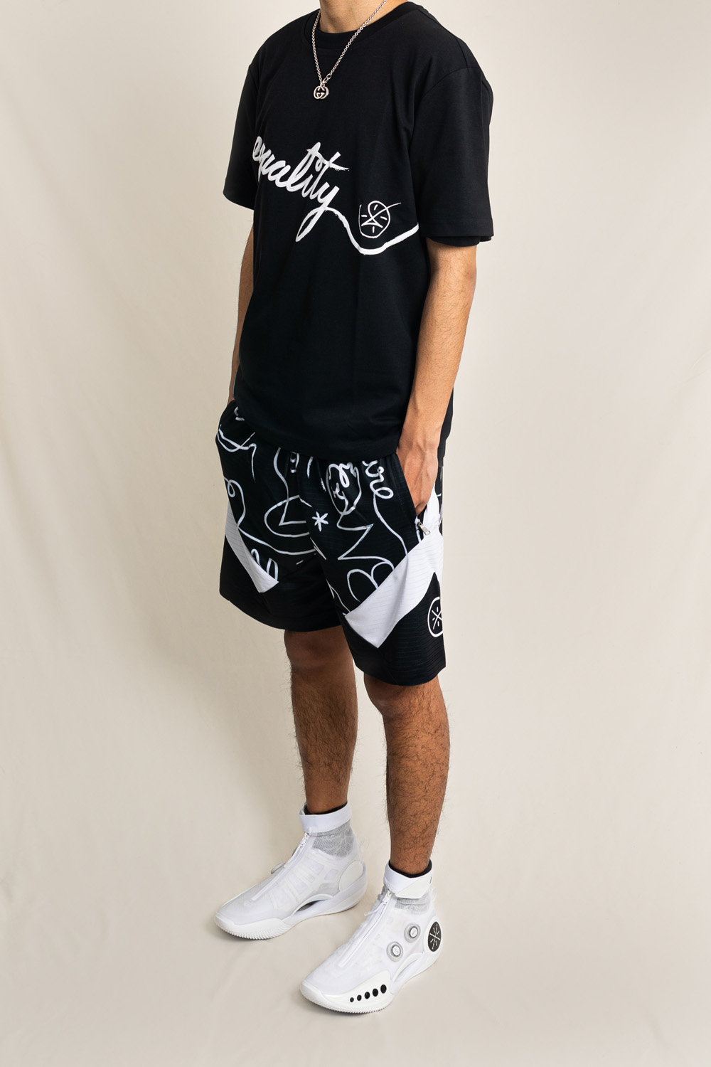 篮球短裤则是以黑白双色共同打造,复杂的线条设计却丝毫不显凌乱。