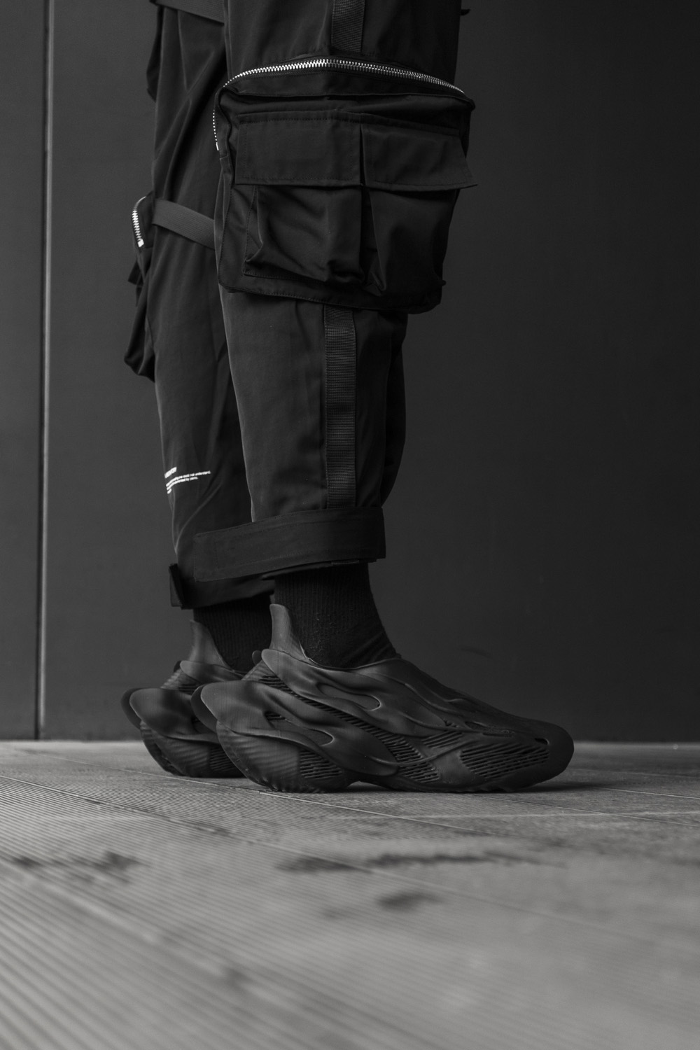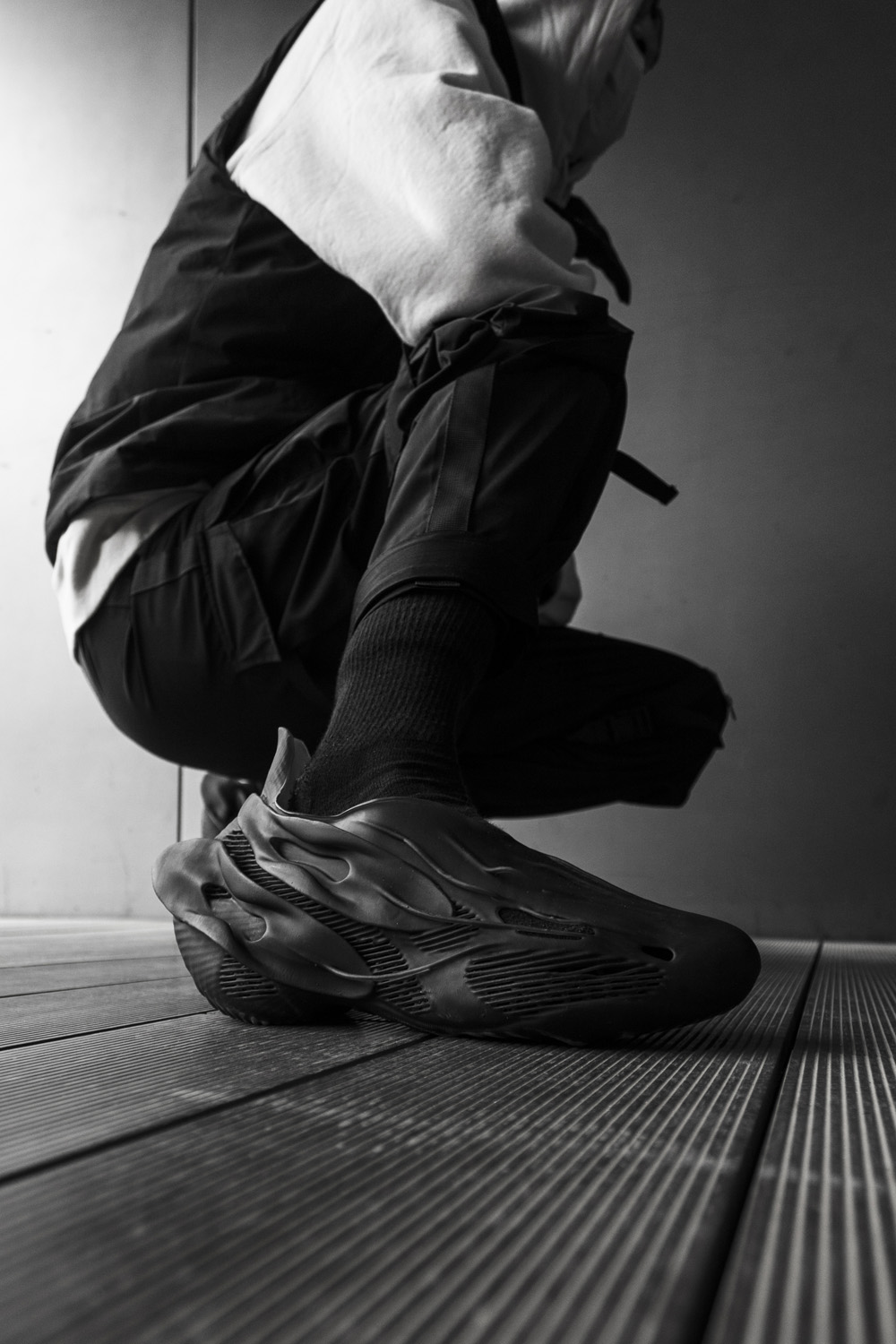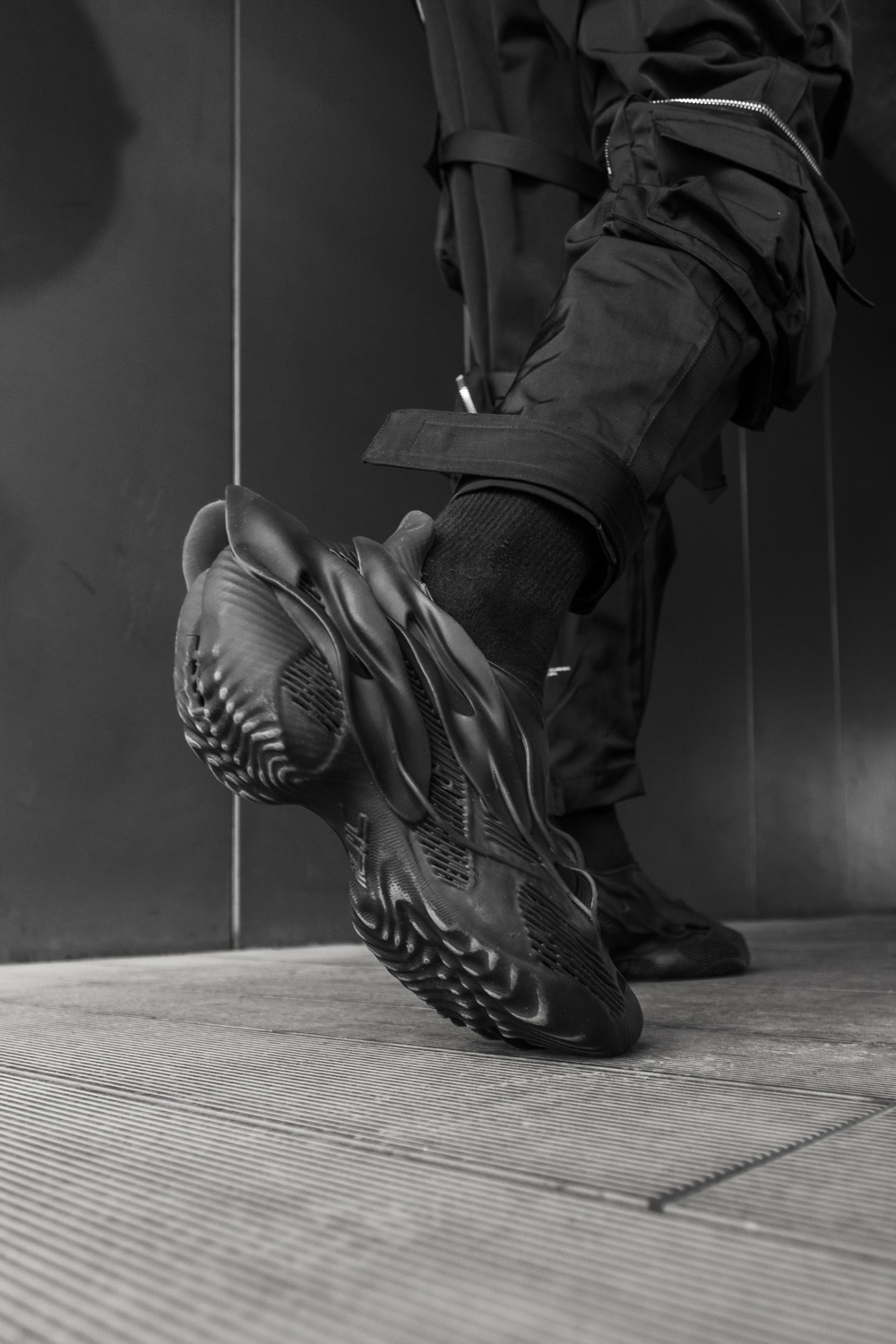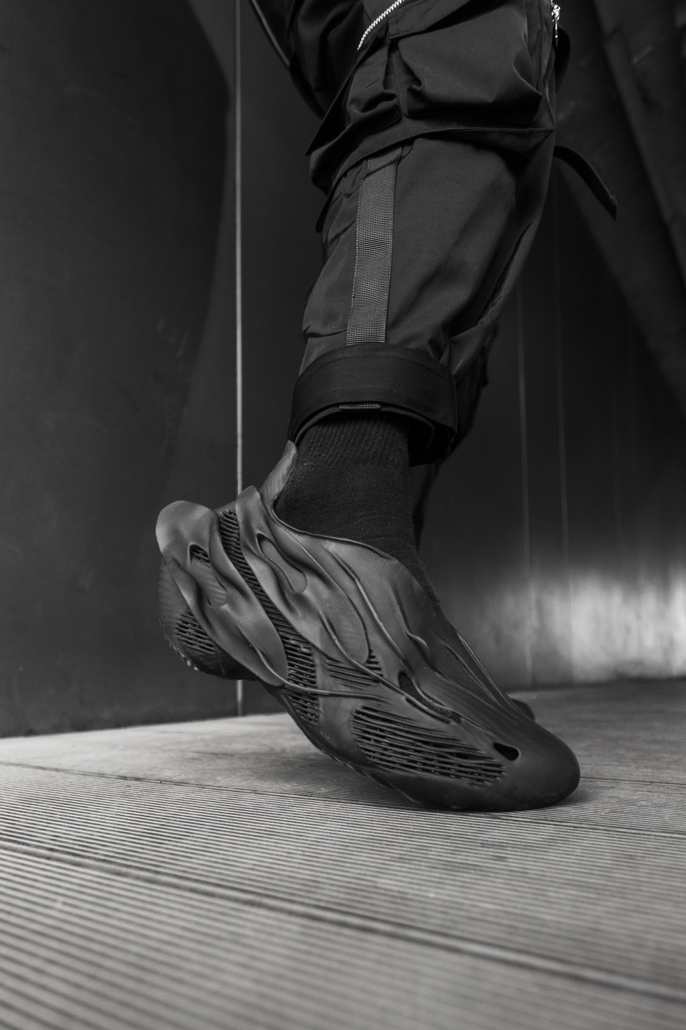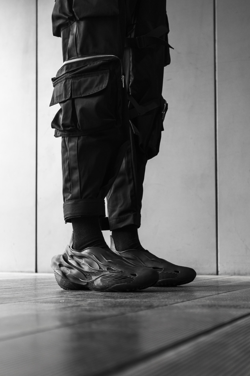 这双鞋通体纯黑,以半透明质感的橡胶打造。