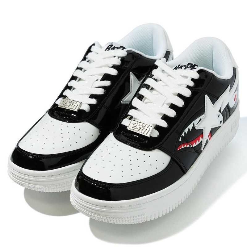 在鞋侧身处的经典 BAPE Logo 下,印有其品牌最标志性的鲨鱼齿图案,为整双球鞋丰富了细节。