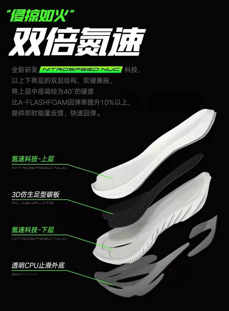 中底采用双层结构,上下层分别采用不同密度的 NITROSPEED NUC 氮速科技。