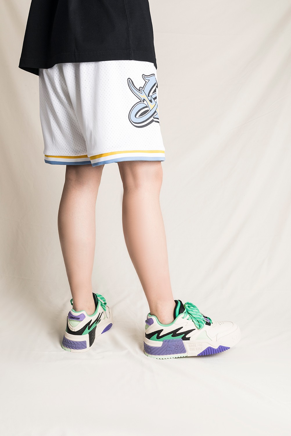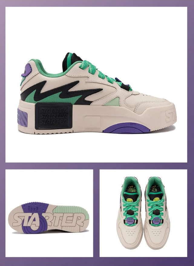 整双鞋在 STARTER VOL 鞋型基础上,采用大面积皮革材质打造鞋身,黑色、绿色以及紫色装扮鞋身,还原 THE MASK 的形象。
